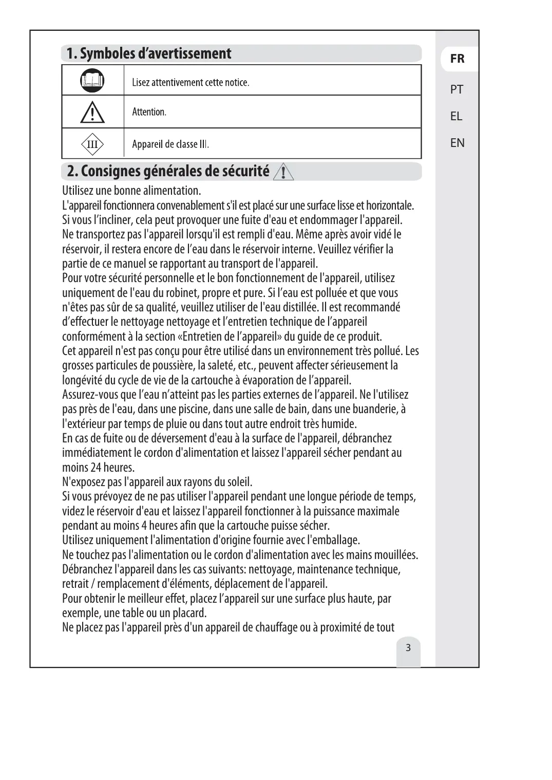 appareil électrique. Ne placez pas l'appareil dans des endroits de passage ou tout autre endroit d'où il pourrait pourrait être renversé accidentellement. Ne laissez entrer aucun corps étranger à l'intérieur de l'appareil. Ne placez pas d'objets lourds sur le dessus de l'appareil. N'obstruez pas les grilles avant et arrière de l'appareil. Ne retournez pas l'appareil. cela perturbera son fonctionnement. Ne plongez pas l'appareil dans l'eau ni dans tout autre liquide. Consultez le guide de nettoyage ci-dessous. Ne placez pas de sources de feu ouvert (bougies, etc.) sur le dessus de l'appareil. Cet appareil peut être utilisé par des enfants agés d'au moins 8 ans et par des personnes ayant des capacités physiques, sensorielles ou mentales réduites ou dénuées d'expérience ou de connaissance, s'ils (si elles) sont correctement surveillé(e)s ou si des instructions relatives à l'utilisation de l'appareil en toute relatives à l'utilisation de l'appareil en toute sécurité leur ont été données et si les risques encourus ont été appréhendés. Les enfants ne doivent pas jouer avec l'appareil. Le nettoyage et l'entretien par l'usager ne doivent pas être effectués par des enfants sans surveillance. On ne doit éteindre complètement l'appareil que lorsqu'il est débranché de l'alimentation électrique. Le fabricant décline toute responsabilité pour les dommages résultant du non-respect du guide de ce produit. Une cartouche à évaporation de rechange est conçue spécifiquement pour ce produit. Si votre cartouche est cassée ou endommagée, vous pouvez en acheter une de rechange auprès de votre revendeur local. Évitez d'exposer l'appareil à de l'eau ou de pulvériser de l'eau sur le panneau de commande ou le voyant LED. Ne pas utiliser de nettoyant corrosif ni de solvant. Avant le stockage, veuillez faire sécher le réservoir d'eau à l'intérieur de l'appareil, puis sortez le filtre et séchez-le afin d'éviter toute mauvaise odeur due à l'humidité. Débranchez l'alimentation lorsque vous ne l'utilisez pas. Si la ligne électrique est endommagée, elle doit être remplacée par le fabricant, son agent de service ou une personne qualifiée similaire afin d'éviter les risques. L'invention ne peut être obtenue qu' à faible tension de sécurité correspondant aux marques sur le dispositif.