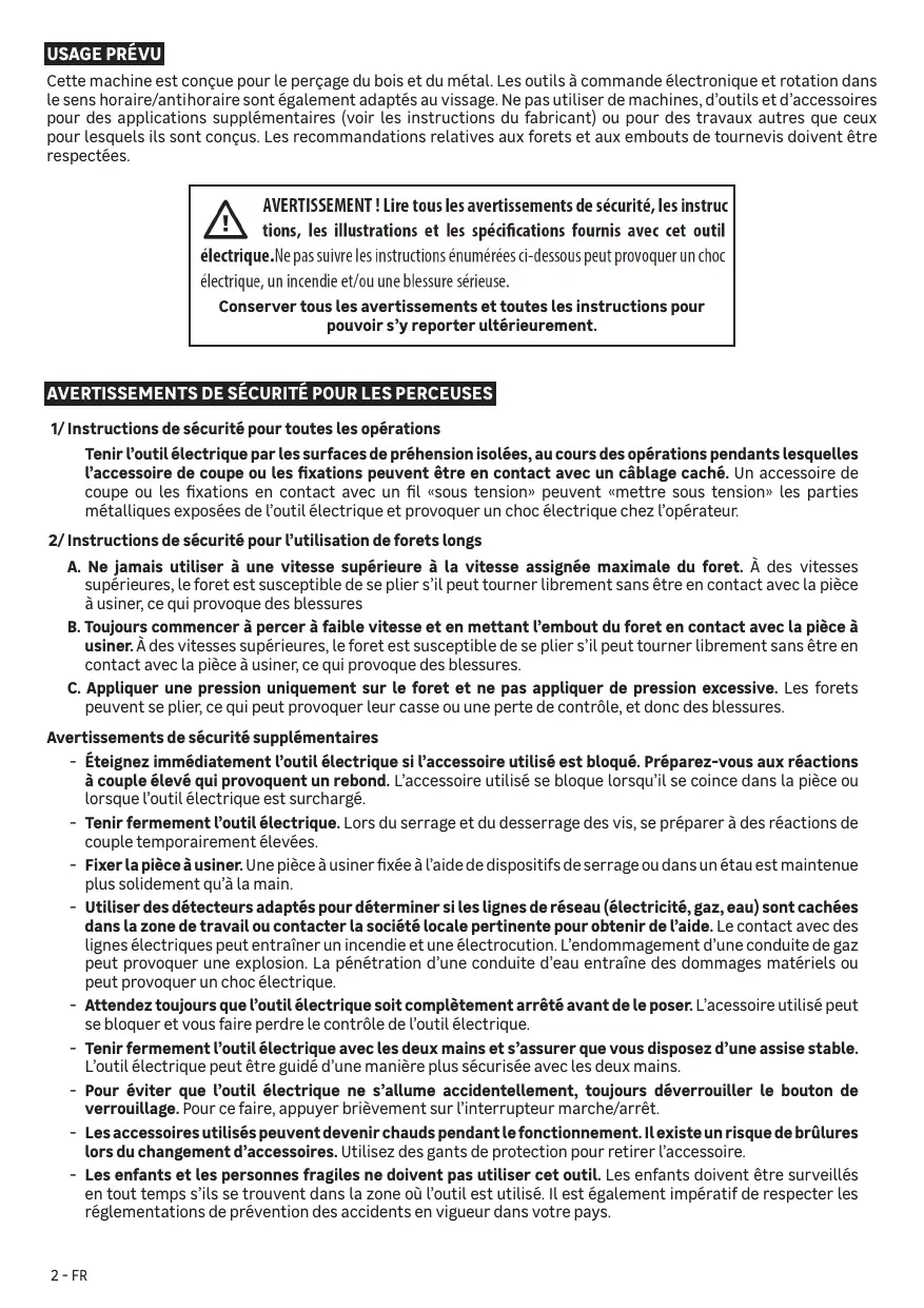 2/ Instructions de sécurité pour l’utilisation de forets longs
