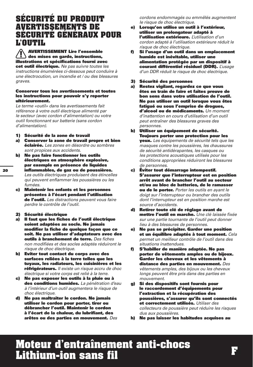 g) Suivez toutes les instructions de charg et ne rechargez pas la batterie ou l'outil en dehors de la plage de température spécifiée dans les instructions. Recharger la batterie de façon inappropriée ou en dehors de la plage de température spécifiée peut l'endommager et augmente le risque d'incendie.