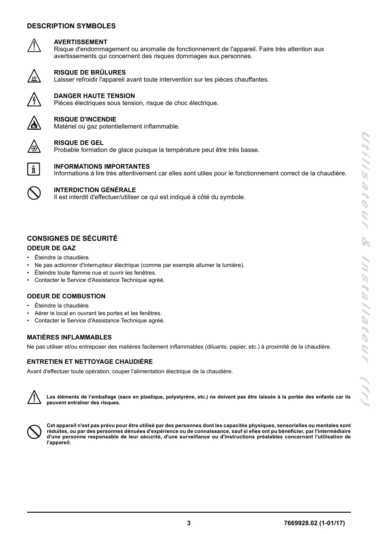 Afin de garantir à votre chaudière une efficacité de fonctionnement et une sécurité parfaite, il faut à la fin de chaque saison la faire inspecter par le Service d'Assistance Technique agréé. Une maintenance sérieuse permet toujours de faire des économies au niveau de la gestion de l'installation. 7 7669928.02 (1-01/17)