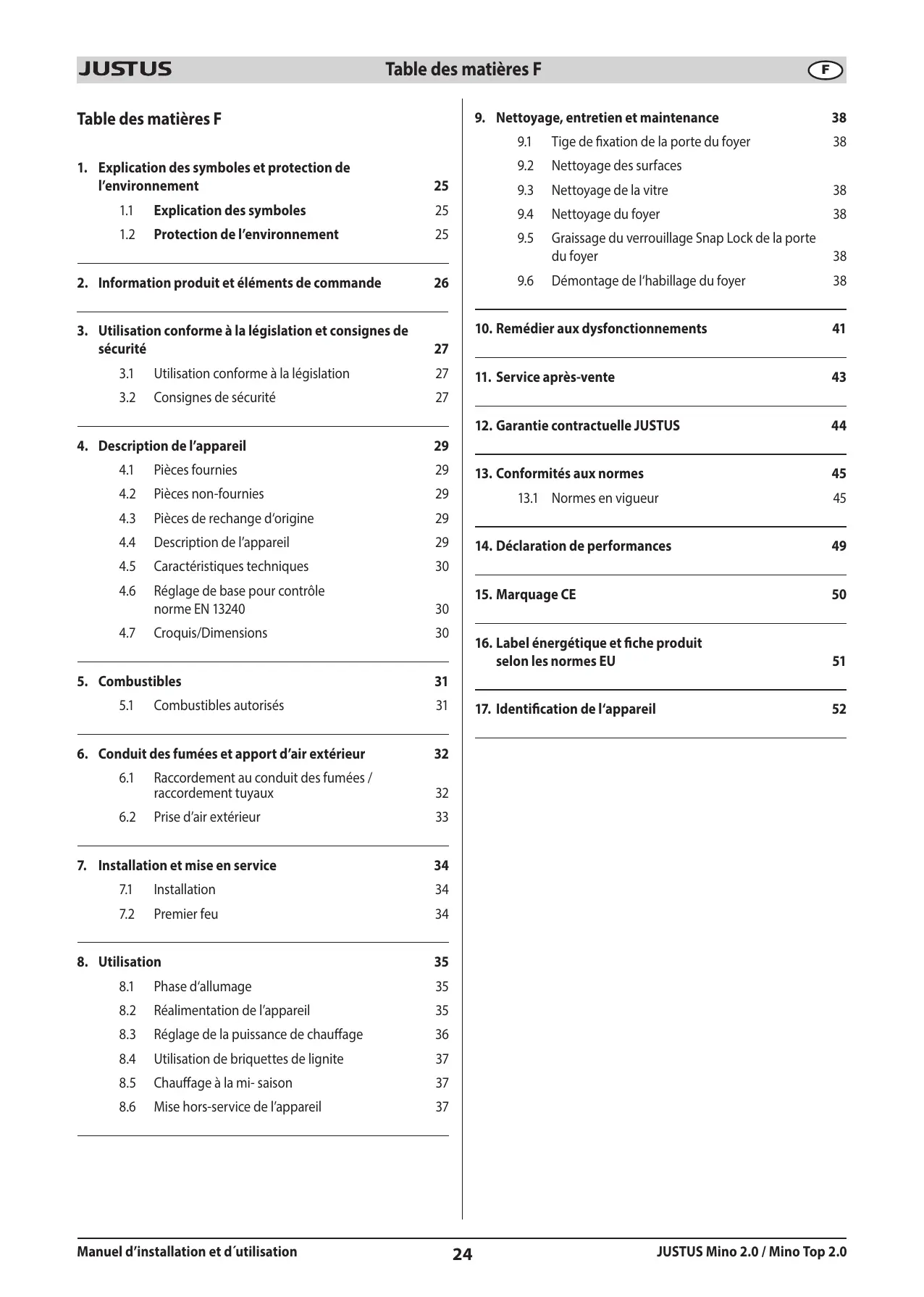 11 Explication des symboles 25 94 Nettoyage du foyer 38 12 Protection de l'environnement 25 95 Graissage du verrouillage Snap Lock de la porte du foyer 38 2. Information produit et éléments de commande 26 96 Démontage de l'habillage du foyer 38 3. 10. Remédier aux dysfonctionnements a 27 31 Utilisation conforme à la législation 27 | 11. Service après-vente 43 3.2 Consignes de sécurité 27 12. Garantie contractuelle JUSTUS 44 4. Description de l'appareil 29 41 Pièces fournies 29 | 13. Conformités aux normes 45 4.2 Pièces non-fournies 29 13.1 Normes en vigueur 45 4.3 Pièces de rechange d'origine 29 44 Description de l'appareil 29 | 14. Déclaration de performances 49 4.5 Caractéristiques techniques 30 4.6 Réglage de base pour contrôle 15. Marquage CE 50 norme EN 13240 30 47 G is/Di 30 roquis/Dimensions 16. Label énergétique et fiche produit selon les normes EU 51 5. Combustibles 31 51 Combustibles autorisés 31 17, Identification de l'appareil 52 6. Conduit des fumées et apport d'air extérieur 32 6.1 Raccordement au conduit des fumées / raccordement tuyaux 32 6.2 Prise d'air extérieur 33 7. Installation et mise en service 34 71 Installation 34 8.5 Chauffage à la mi- saison 37 8.6 Mise hors-service de l'appareil 37