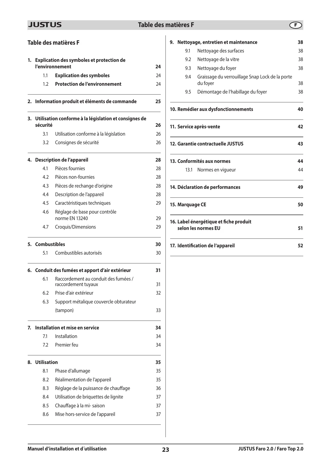 9.5 Démontage de l'habillage du foyer 38 10. Remédier aux dysfonctionnements 40 11. Service après-vente 42 12. Garantie contractuelle JUSTUS 43 13. Conformités aux normes 44 131 Normes en vigueur 44 14. Déclaration de performances 49 15. Marquage CE 50