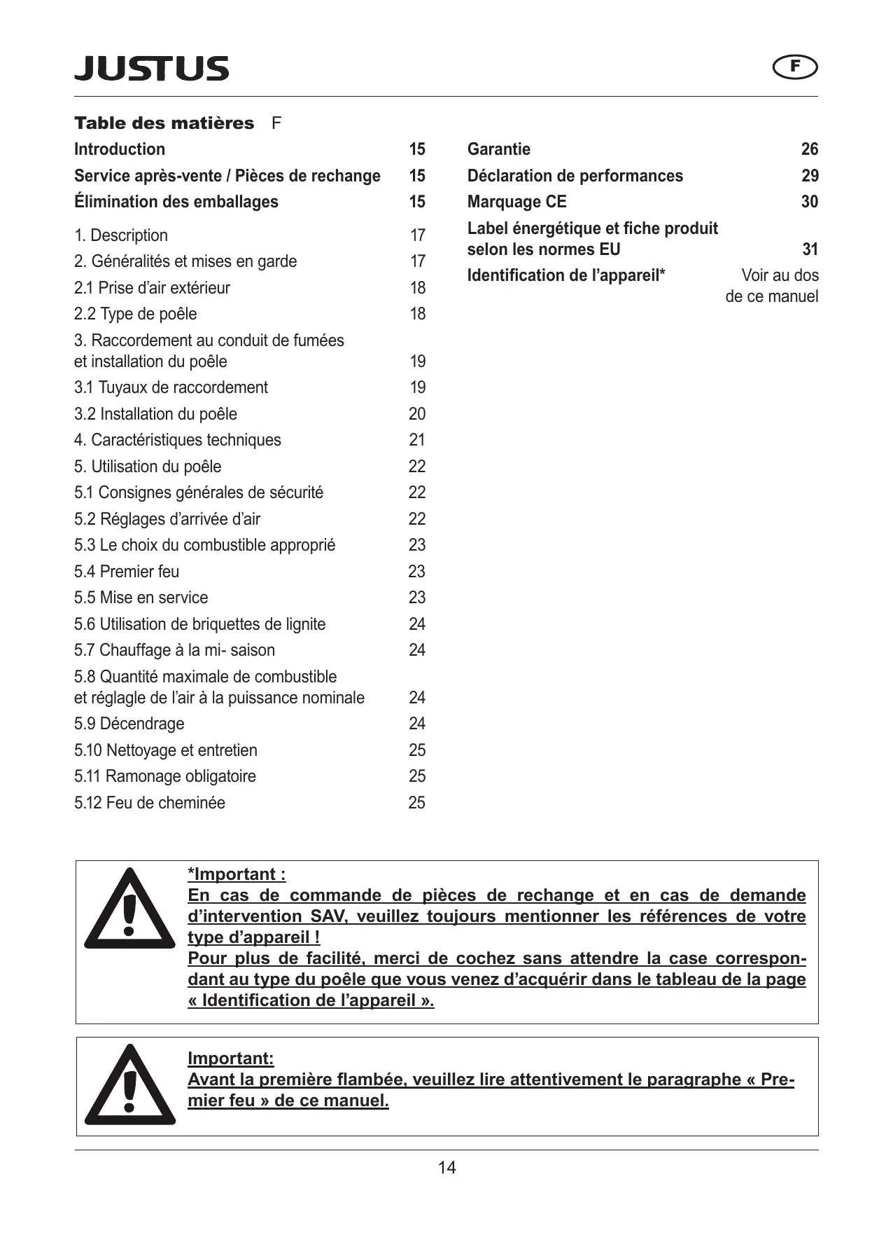 Cet appareil a été concu pour la combustion de bois. Il est formellement interdit de l'utiliser comme incinérateur ou d'y brûler des combus- tibles liquides, du charbon ou des dérivés du charbon.