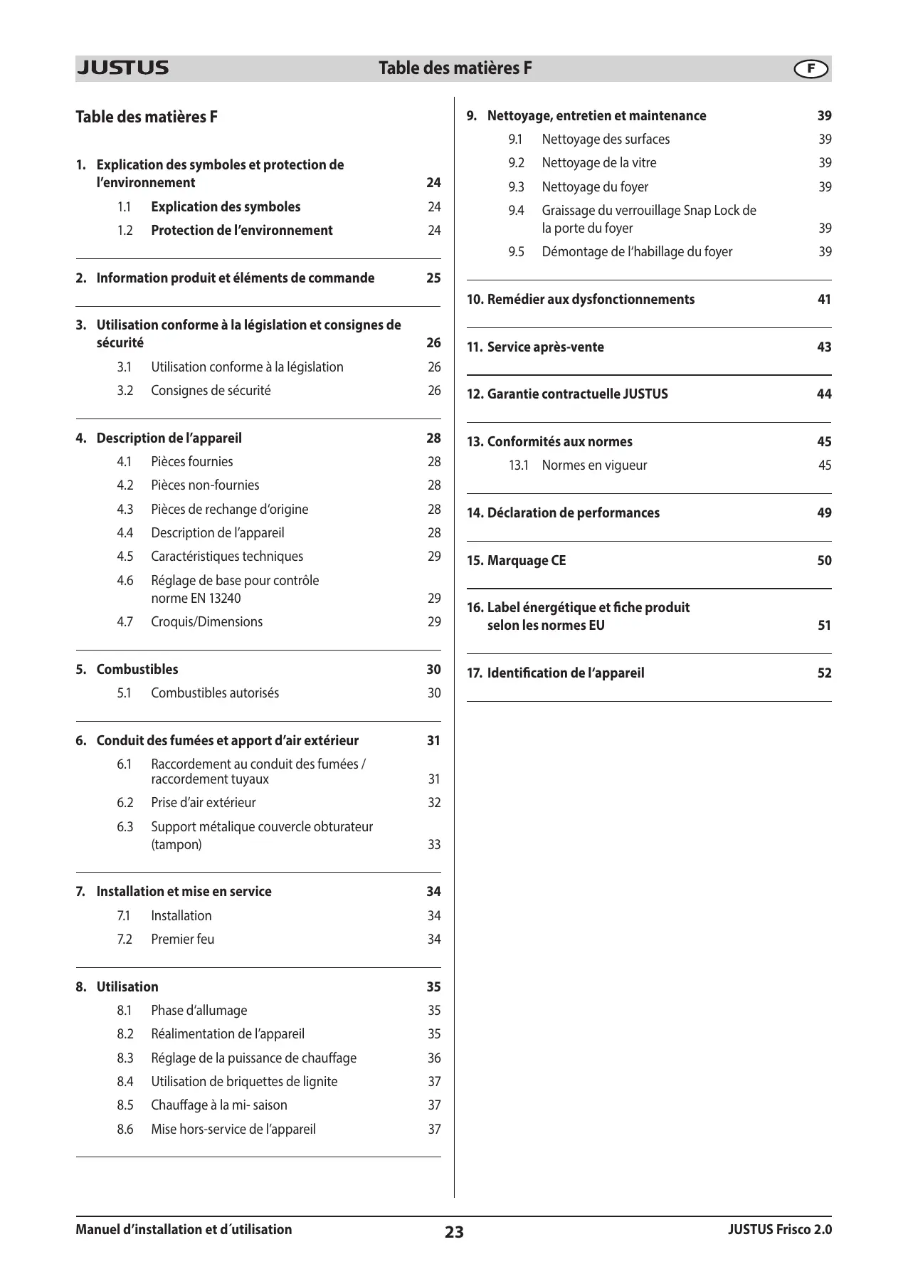 12 Protection de l'environnement 24 la porte du foyer 39 9.5 Démontage de l'habillage du foyer 39 2. Information produit et éléments de commande 25 10. Remédier aux dysfonctionnements Gil 3. 26 11. Service après-vente 43 31 Utilisation conforme à la législation 26 3.2 Consignes de sécurité 26 | 12. Garantie contractuelle JUSTUS 44 4. Description de l'appareil 28 | 13. Conformités aux normes 45 41 Pièces fournies 28 13.1 Normes en vigueur 45 4.2 Pièces non-fournies 28 43 Pièces de rechange d'origine 28 | 14. Déclaration de performances 49 44 Description de l'appareil 28 4.5 Caractéristiques techniques 29 | 15. Marquage CE 50 4.6 Réglage de base pour contrôle norme EN 13240 2 16. Label énergétique et fiche produit 4.7 Croquis/Dimensions 29 selon les normes EU 51 5. Combustibles 30 | 17. Identification de l'appareil 52 51 Combustibles autorisés 30 6. Conduit des fumées et apport d'air extérieur 31 6.1 Raccordement au conduit des fumées / raccordement tuyaux 31 6.2 Prise d'air extérieur 32 8.5 Chauffage à la mi- saison 37 8.6 Mise hors-service de l'appareil 37
