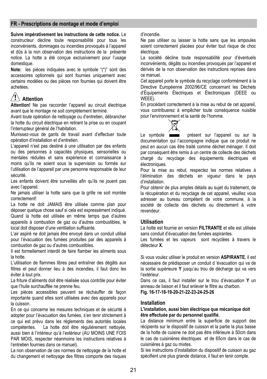 En ce qui concerne les mesures techniques et de sécurité à adopter pour l'évacuation des fumées, s'en tenir strictement à ce qui est prévu dans les règlements des autorités locales compétentes. La hotte doit être régulièrement netoyée, aussi bien à l'intérieur qu'à l'extérieur (AU MOINS UNE FOIS PAR MOIS, respecter néanmoins les instructions relatives à l'entretien fournies dans ce manuel)