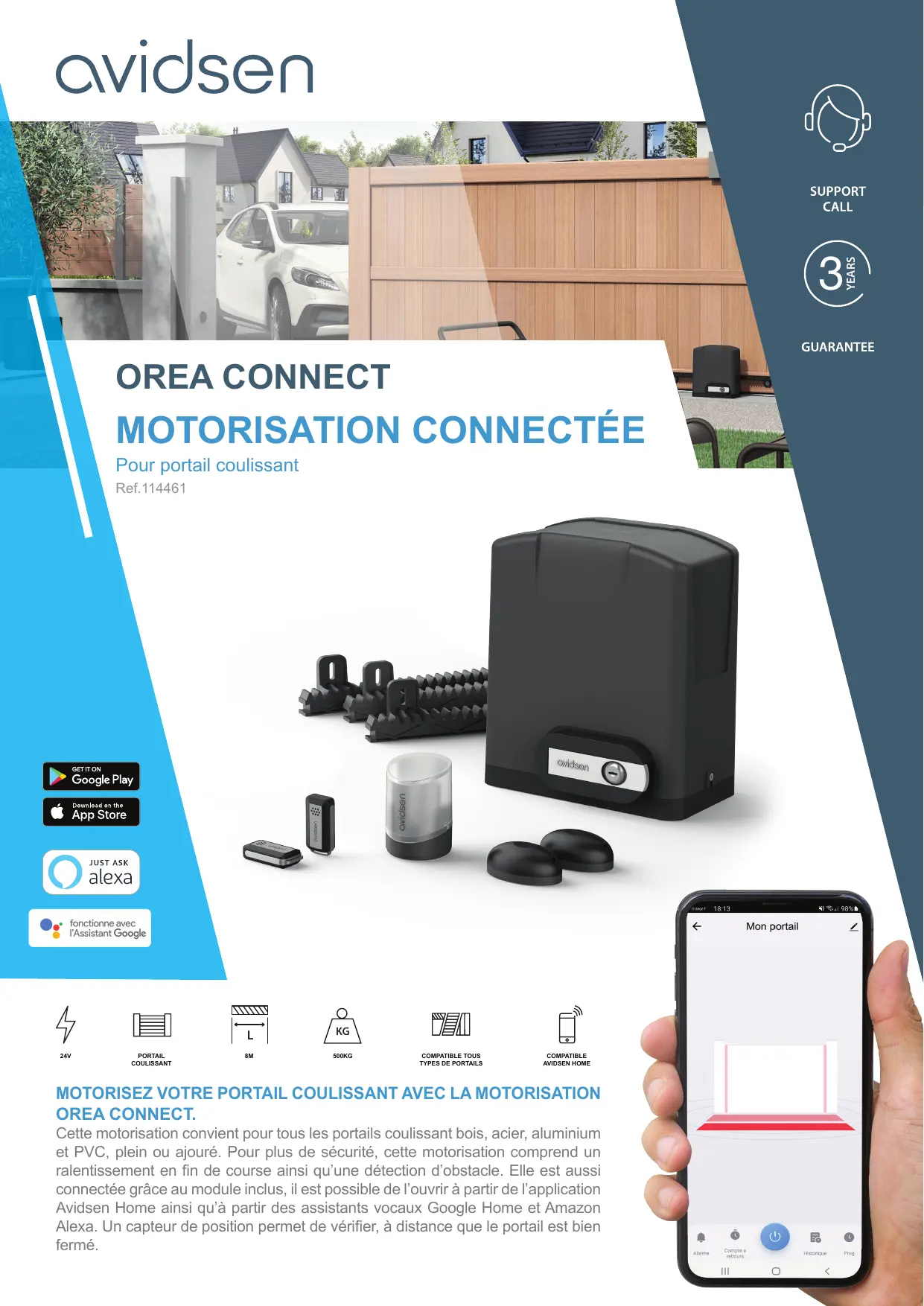 - Ouverture et fermeture du portail à partir de l'application Avidsen Home, compatible Google Home et Amazon Alexa (nécessite une connexion WIFI et un abonnement Internet) - Le capteur de position permet de vérifier, à distance que le portail est bien fermé