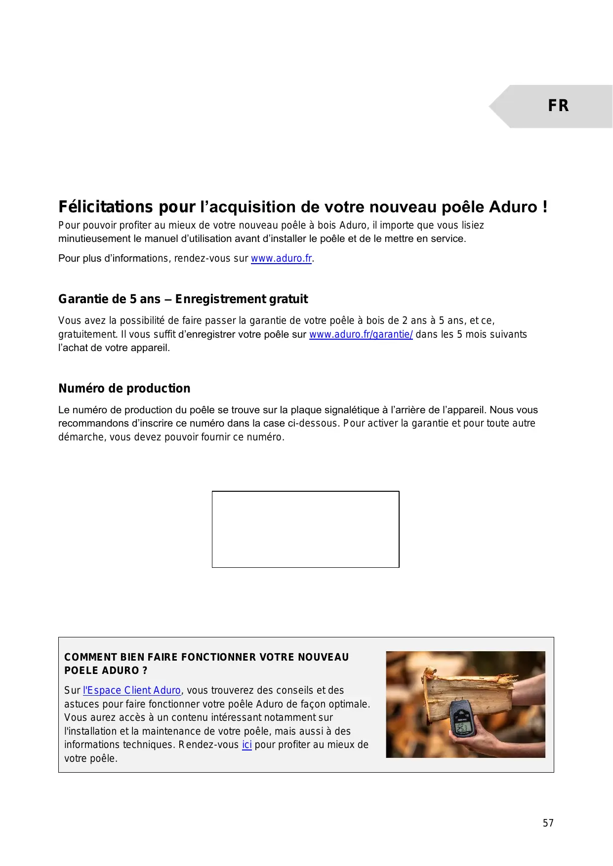 Félicitations pour l’acquisition de votre nouveau poêle Aduro Pour pouvoir profiter au mieux de votre nouveau poêle à bois Aduro, il importe que vous lisiez minutieusement le manuel d'utilisation avant d'installer le poêle et de le mettre en service. Pour plus d'informations, rendez-vous sur www.aduro.fr. Garantie de 5 ans -— Enregistrement gratuit Vous avez la possibilité de faire passer la garantie de votre poêle à bois de 2 ans à 5 ans, etce, gratuitement. Il vous suffit d'enregistrer votre poêle sur www.aduro.fr/garantie/ dans les 5 mois suivants l'achat de votre appareil. Numéro de production Le numéro de production du poêle se trouve sur la plaque signalétique à l'arrière de l'appareil. Nous vous recommandons d'inscrire ce numéro dans la case ci-dessous. Pour activer la garantie et pour toute autre démarche, vous devez pouvoir fournir ce numéro.