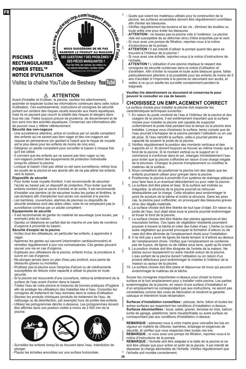 ATTENTION ! L'utilisation d'une piscine implique le respect des consignes de sécunté contenues dans la notice d'utilisation et d'entretien. Afin d'éviter la noyade et toute autre blessure grave, faites particulièrement attention à la possiblté pour les enfants de moins de 5 ans d'accéder à l'mprovste à la piscine en sécurisant son accès, et veilez à ce qu'un aduite les surveille constamment pendant la baignade.