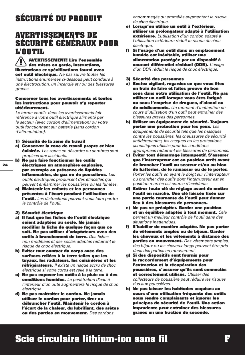 ou sous l'emprise de drogues, d'alcool ou de médicaments. Un moment d'inattention en cours d'utilisation d'un outil peut entrainer des blessures graves des personnes.