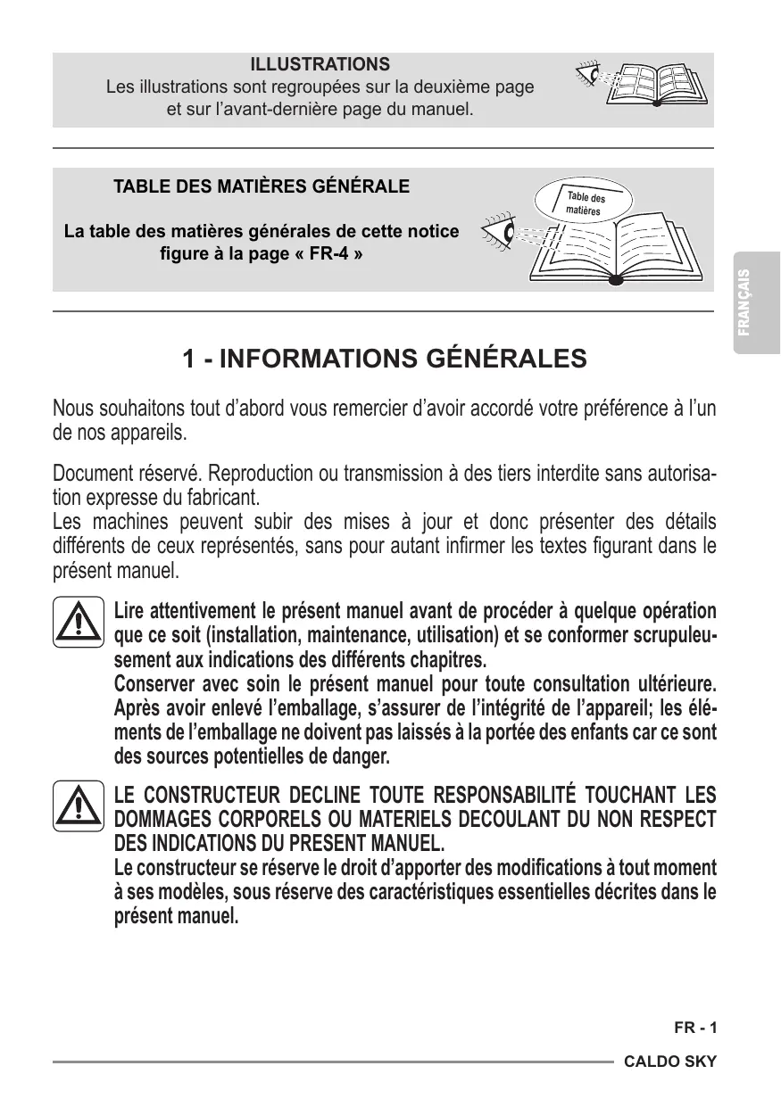 LE CONSTRUCTEUR DECLINE TOUTE RESPONSABILITÉ TOUCHANT LES DOMMAGES CORPORELS OU MATERIELS DECOULANT DU NON RESPECT DES INDICATIONS DU PRESENT MANUEL.