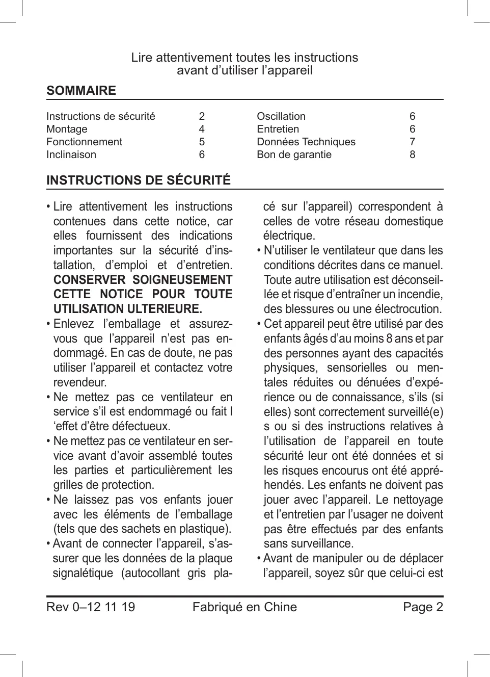 - N'utiliser le ventilateur que dans les conditions décrites dans ce manuel.