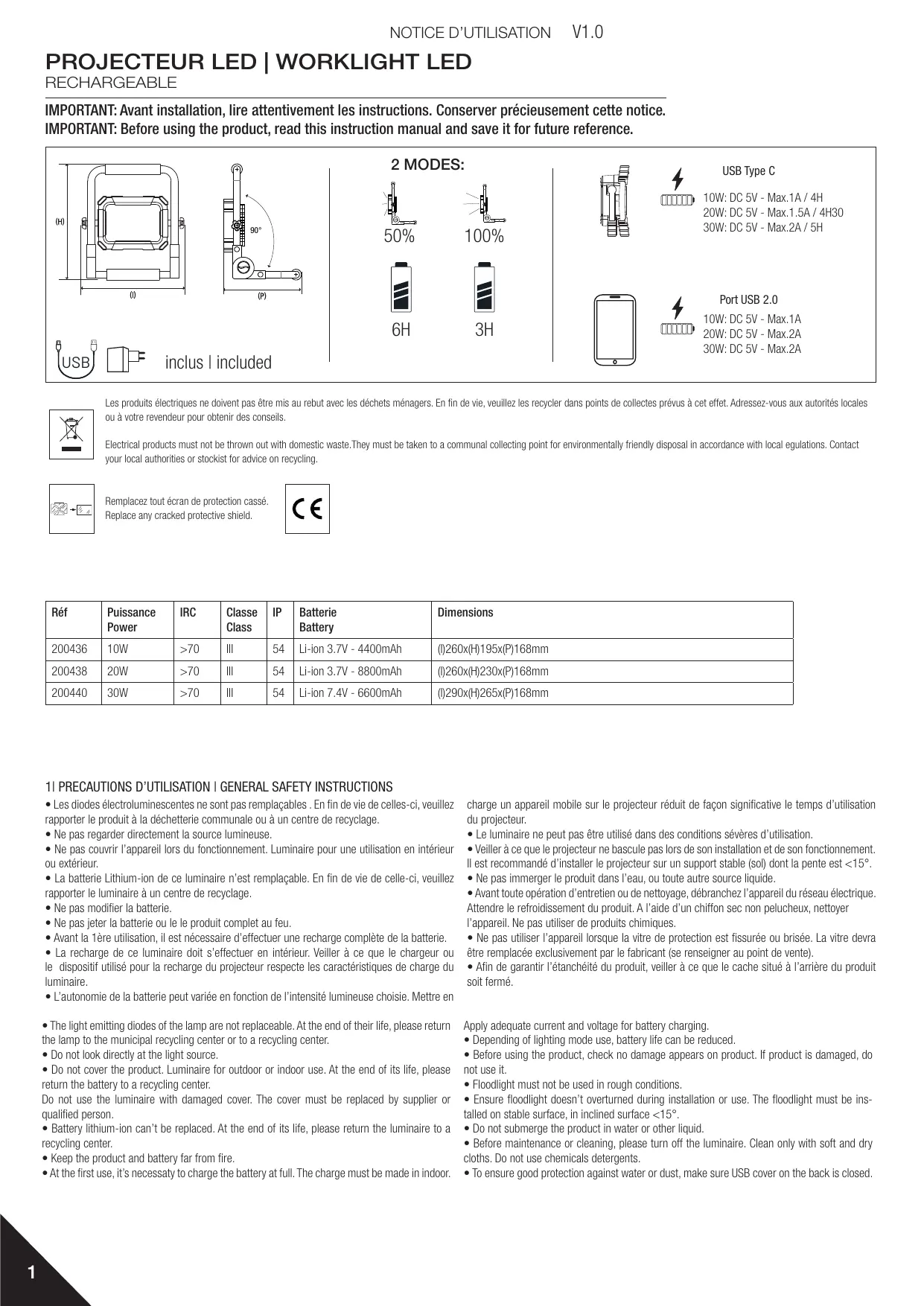 + Les diodes électroluminescentes ne sont pas remplaçables . En fin de vie de celles-ci, veuillez rapporter le produit à la déchetterie communale ou à un centre de recyclage + Ne pas regarder directement la source lumineuse. + Ne pas couvrir l'appareil lors du fonctionnement. Luminaire pour une utilisation en intérieur ou extérieur. + La batterie Lithium-ion de ce luminaire n'est remplaçable. En fin de vie de celle-ci, veuilez rapporter le luminaire à un centre de recyclage. + Ne pas modifier la batterie + Ne pas jeter la batterie ou le le produit complet au feu: + Avant la 1ère utilisation, il est nécessaire d'effectuer une recharge complète de la batterie. + La recharge de ce luminaire doit s'effectuer en intérieur. Veiler à ce que le chargeur où le dispositif utlisé pour la recharge du projecteur respecte les caractéristiques de charge du luminaire. + L'autonomie de la batterie peut variée en fonction de l'intensité lumineuse choisie. Mettre en The light emitting diodes of the lamp are not replaceable. At the end of their fe, please return the lamp to the municipal recycling center or to a recycling center. Do not look directiy at the light source. + Do not cover the product. Luminaire for outdoor or indoor use. At the end of it life, please return the battery to a recycling center. Do not use the luminaire with damaged cover. The cover must be replaced by supplier or qualfied person. + Battery Ithium-ion can't be replaced. At the end of its life, please retum the luminaire to a recycling center. Keep the product and battery far from fire. + Atthe first use, is necessaty to charge the battery at ful. The charge must be made in indoor. charge un appareil mobile sur le projecteur réduit de façon significative le temps d'utilisation du projecteur. + Le luminaire ne peut pas être utilisé dans des conditions sévères d'utilisation Veiller à ce que le projecteur ne bascule pas lors de son installation et de son fonctionnement IL est recommandé d'installer le projecteur sur un support stable (sol dont la pente est <15° Ne pas immerger le produit dans l'eau, ou toute autre source liquide + Aant toute opération d'entretien ou de nettoyage, débranchez l'apparel du réseau électrique. Attendre le refroidissement du produit. À l'aide d'un chiffon sec non pelucheux, nettoyer l'appareil. Ne pas utiliser de produits chimiques. + Ne pas utiliser l'appareil lorsque la vitre de protection est fissurée ou brisée. La vitre devra être remplacée exclusivement par le fabricant (se renseigner au point de vente). + Afin de garantir l'étanchéité du produit, veiller à ce que le cache situé à l'amière du produit soi fermé. Apoly adequate current and voitage for battery charging. + Depending of lighting mode use, battery ie can be reduced + Before using the product, check no damage appears on product. f product is damaged, do not use it. Floodlight must not be used in rough conditions. + Ensure floodight doesn't overturned during installation or use. The flooclight must be ins- talled on stable surface, in inclined surface <15° + Do not submerge the product in water or other liquicl + Before maintenance or cleaning, please turn off the luminaire, Clean only with soft and dry cloths. Do not use chemicals detergents. + To ensure good protection against water or dust, make sure USB cover on the back is closed.