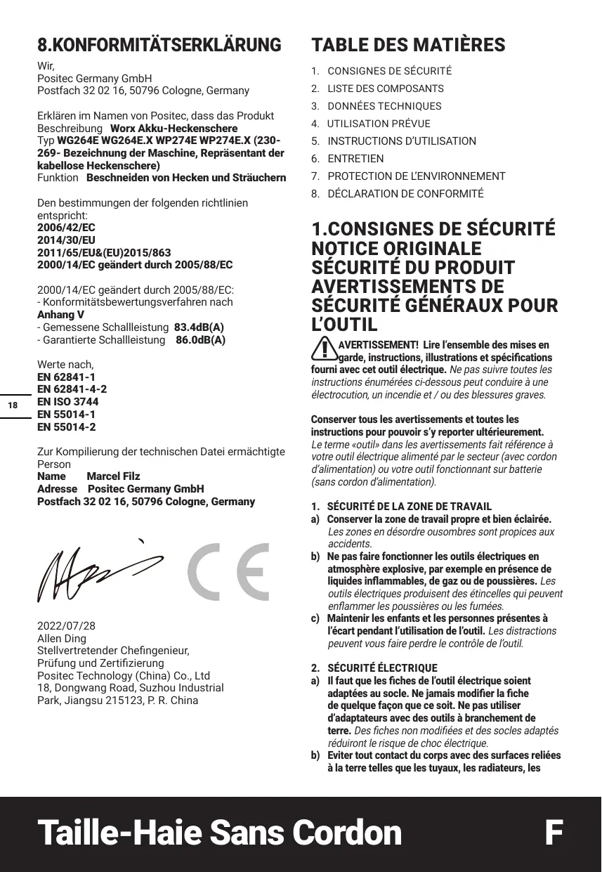 Positec déclare que le produit Description Taille-haie sans cordon Worx