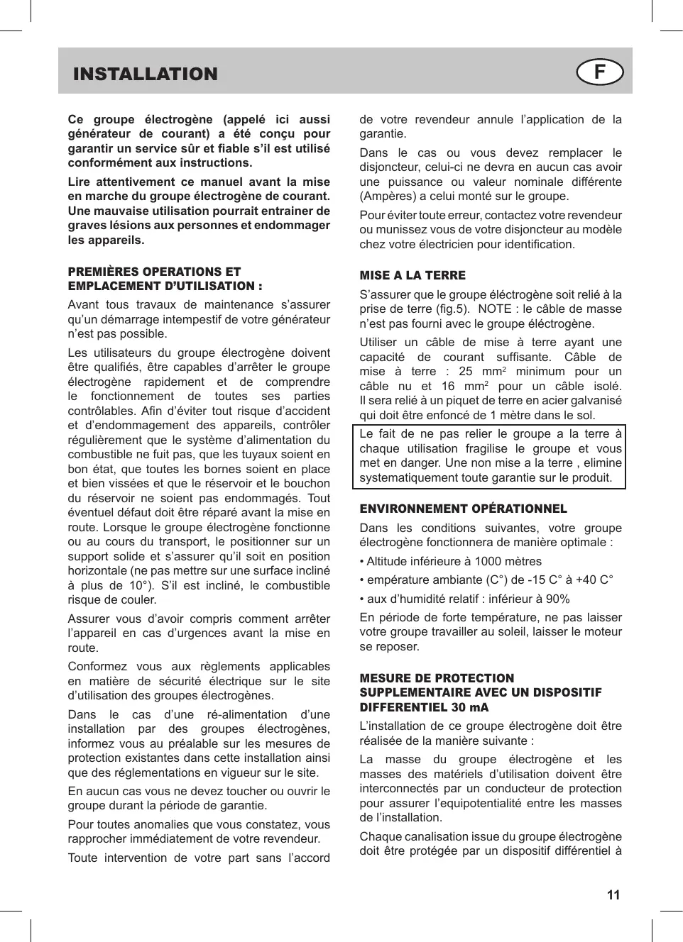 INSTALLATION Ce groupe électrogène (appelé ici aussi générateur de courant) a été conçu pour garantir un service sûr et fiable s’il est utilisé conformément aux instructions. Lire attentivement ce manuel avant la mise en marche du groupe électrogène de courant. Une mauvaise utilisation pourrait entrainer de graves lésions aux personnes et endommager les appareils.