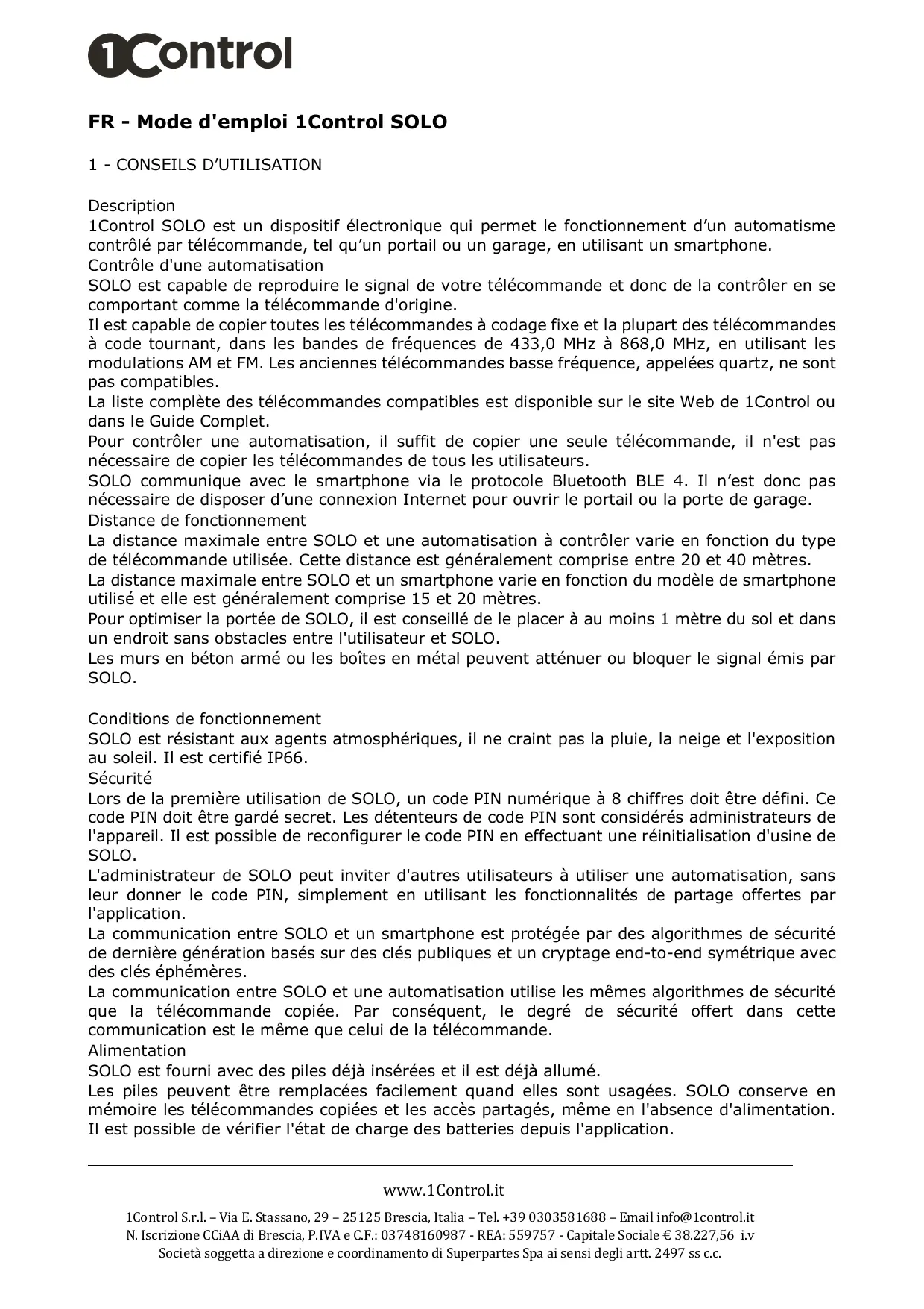 Copie d'une télécommande La copie d'une télécommande a lieu en suivant l'assistant disponible sur l'application. SOLO est capable de reconnaître automatiquement le type de télécommande que vous copiez et de fournir la procédure de copie appropriée via l'application. NB: lors de la copie d'une télécommande, il est conseillé d'être près du portail ou du garage concerné. La liste complète des télécommandes compatibles est disponible sur le site Web de 1Control ou dans le Guide Complet. Partages Les administrateurs de l'appareil peuvent partager un accès enregistré sur SOLO depuis l'application. Tous les utilisateurs qui souhaitent recevoir un partage doivent s'inscrire depuis l'application en entrant leur numéro de téléphone. NB: il n'est pas possible d'utiliser le même numéro de téléphone pour s'enregistrer à partir de différents smartphones. L'administrateur peut partager l'accès à un utilisateur en indiquant son numéro de téléphone. Il est possible de définir des contraintes de temps (date de début et de fin, jours de la semaine, heures du jour) pour les partages. Pour partager un accès, il n'est pas nécessaire d'être à proximité de l'appareil, cette opération peut également être effectuée à distance. Réinitialisation d'usine Vous pouvez supprimer complètement toutes les données stockées sur SOLO en les rétablissant aux conditions d'usine. Pour réinitialiser, maintenez la touche interne enfoncée pendant plus de 10 secondes. La réinitialisation de l'appareil peut prendre jusqu'à 2 minutes. La restauration de l'appareil entraîne la perte de toutes les radiocommandes mémorisées et invalide tous les partages créés. Service après vente En cas de problème, écrivez à support@1control.it Contenu de la boite 1 dispositif SOLO1 support de fixation murale ou sur poteau2 chevilles pour la fixation murale avec vis correspondantes? colliers pour montage sur poteau? piles (déjà insérées) Autres données www.1Control.it 1Control S.r.l. - Via E, Stassano, 29 - 25125 Brescia, Italia - Tel. +39 0303581688 - Email info@ 1control.it N. Iscrizione CCiAA di Brescia, P.Iva e C.F.: 03748160987 - REA: 559757 - Capitale Sociale € 30.297,00 iv Società soggetta a direzione e coordinamento di Superpartes Spa ai sensi degli artt, 2497 ss cc.
