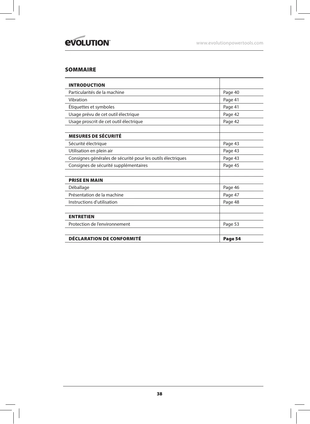 EVOLUTION SOMMAIRE INTRODUCTION Particularités de la machine Page 40 Vibration Page 41 Étiquettes et symboles Page 41 Usage prévu de cet outil électrique Page 42 Usage proscrit de cet outil électrique Page 42
