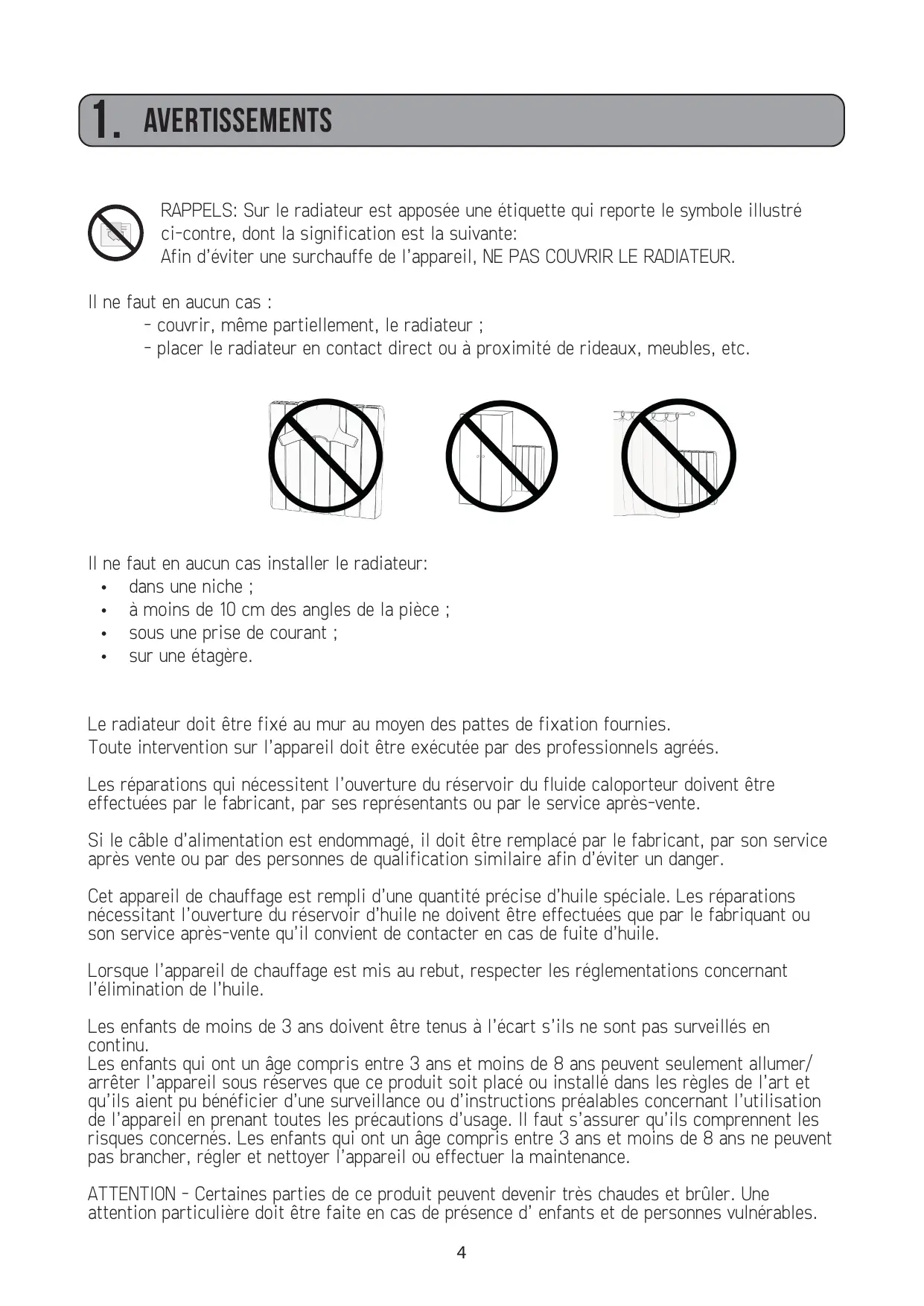 - couvrir, même partiellement, le radiateur ; - placer le radiateur en contact direct ou à proximité de rideaux, meubles, etc.