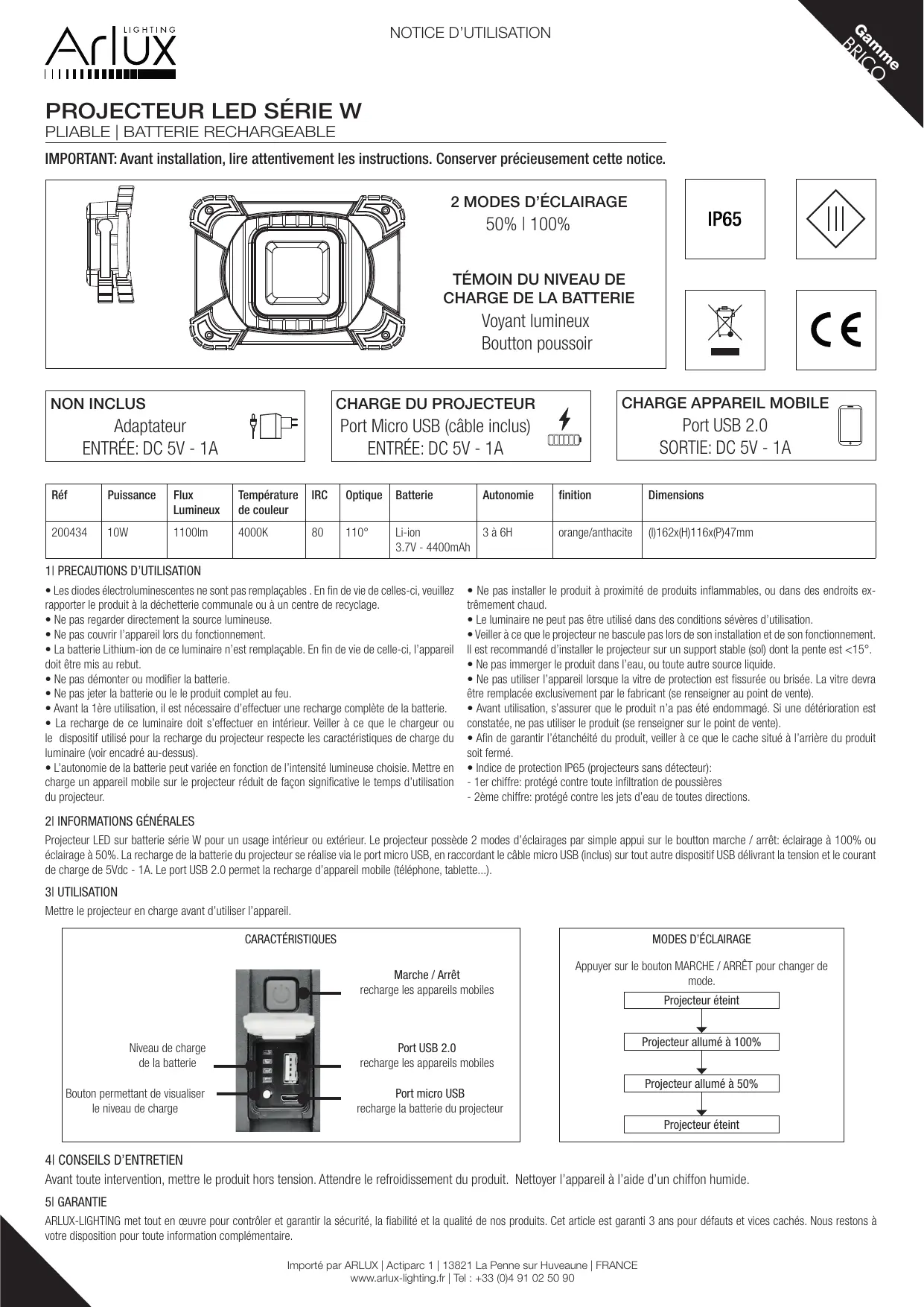 Appuyer sur le bouton MARCHE / ARRÊT pour changer de mode. Projecteur éteint Projecteur allumé à 100% Projecteur allumé à 50% Projecteur éteint Al CONSEILS D'ENTRETIEN Avant toute intervention, mettre le produit hors tension. Attendre le refroidissement du produit. 51 GARANTIE Nettoyer l'appareil à l'aide d'un chiffon humide. ARLUX-LIGHTING met tout en œuvre pour contrôler et garantir la sécurité, la fiabilité et la qualité de nos produits. Cet article est garanti 3 ans pour défauts et vices cachés. Nous restons à votre disposition pour toute information complémentaire. Importé par ARLUX | Actiparc 1 | 18821 La Penne sur Huveaune | FRANCE wwwaux-lighting.fr | Tel : +33 (0)4 91 02 50 90