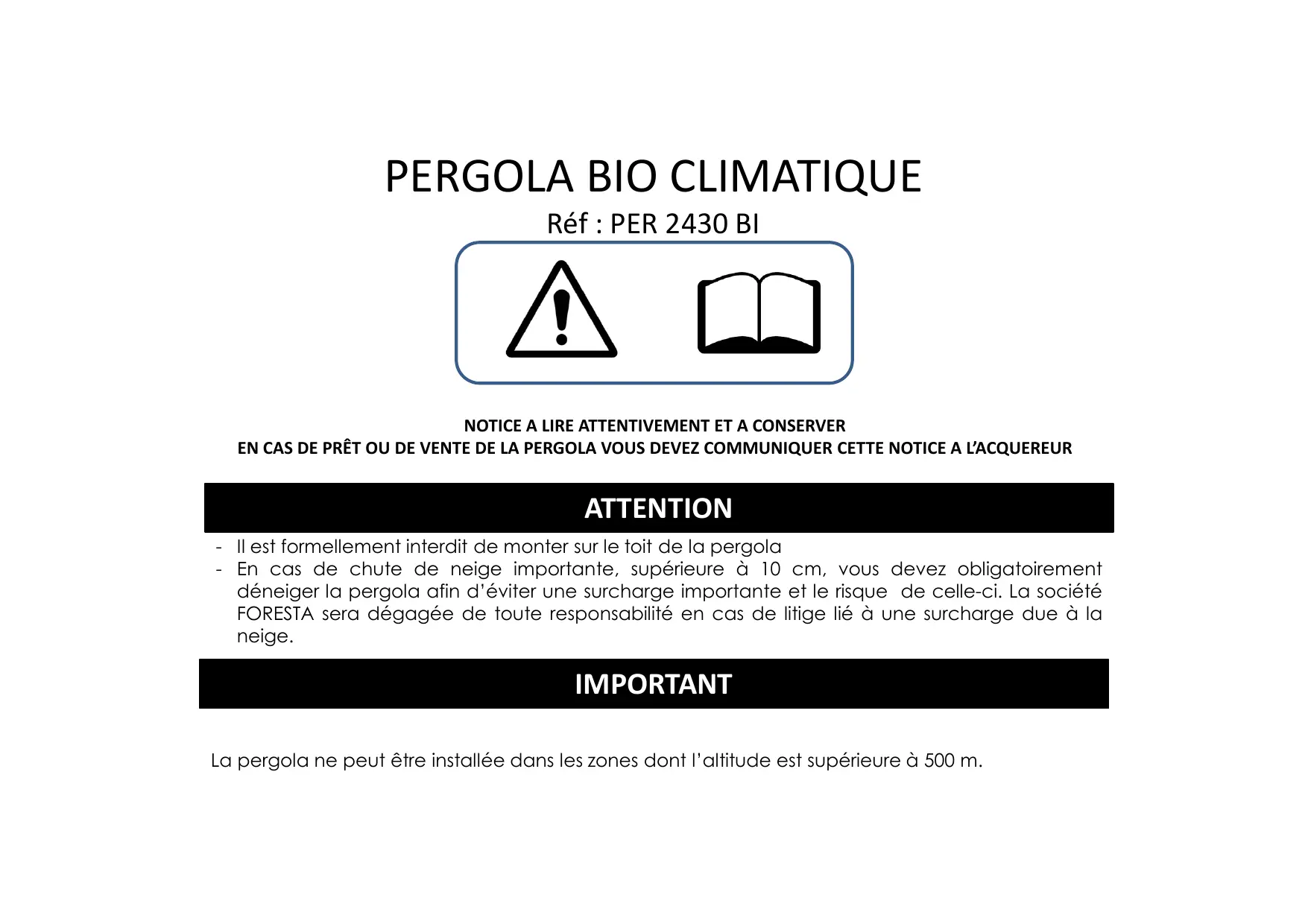 - En cas de chute de neige importante, supérieure à 10 cm, vousdezobligatoirement déneiger la pergola afin d'eviter une surcharge importante et le risque de cette-ci. La société FORESTA sera dégagée de toute responsabilité en cas de litige lié à une surcharge due à la neige.