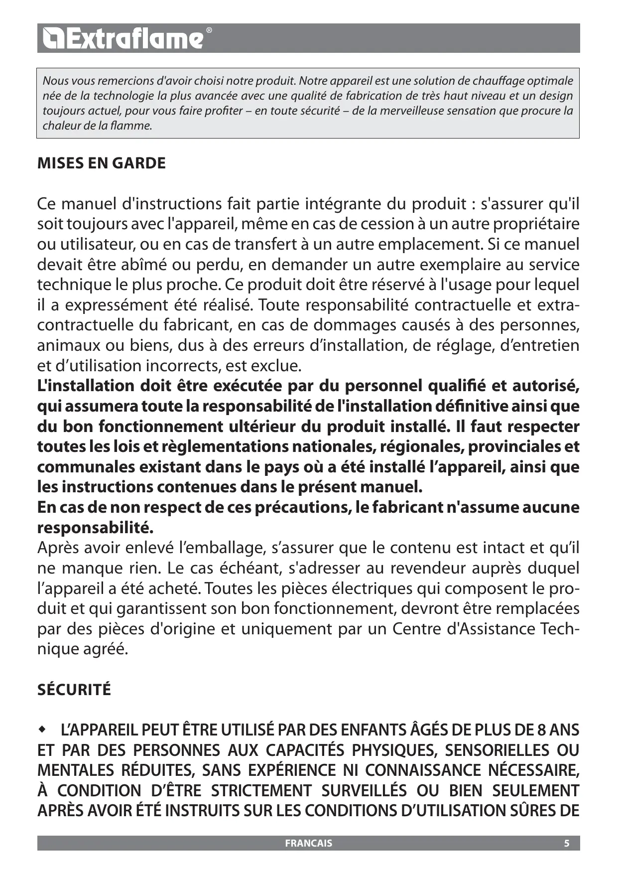 QExtraflame Nous vous remercions d'avoir choisi notre produit. Notre appareil est une solution de chauffage optimale née de la technologie la plus avancée avec une qualité de fabrication de très haut niveau et un design toujours actuel, pour vous faire profiter — en toute sécurité — de la merveilleuse sensation que procure la chaleur de la flamme.
