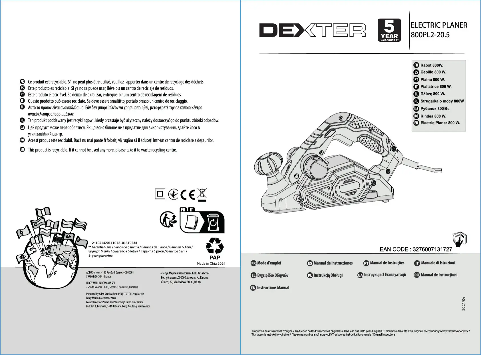 800PL2-20.5 - Rabot électrique DEXTER - Notice d'utilisation et mode d'emploi gratuit
