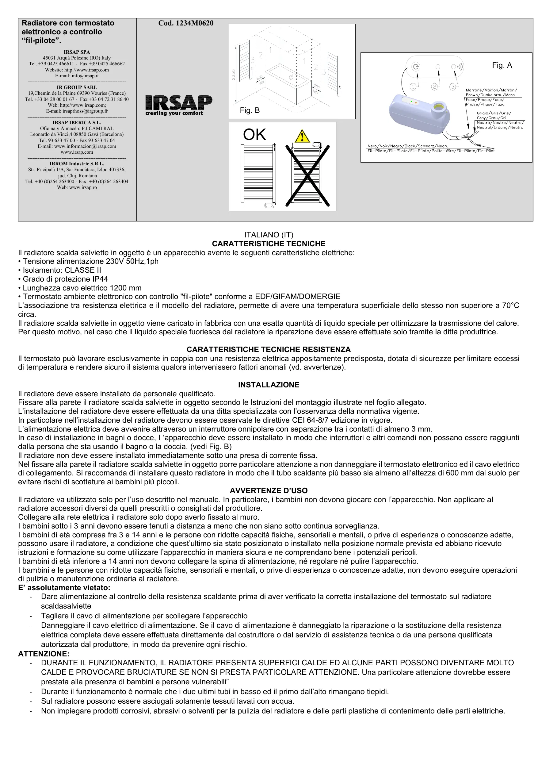 Le thermostat peut travailler exclusivement associé à une résistance électrique expressément prévue à cet effet, munie de sécurités pour limiter les excès de température et sécuriser le système en cas de facteurs anormaux (voir Avertissements) INSTALLATION Le radiateur doit être installe par du personnel qualifie. Fixer le Sèche-Serviettes en question à la paroi selon les instructions de montage ci-jointes. Le montage doit être effectué par une entreprise spécialisée et conformément aux normes en vigueur. Pour l'installation du radiateur il est nécessaire d'observer les directives NF C15-100 édition en vigueur. L'alimentation électrique doit arriver par un interrupteur omnipolaire avec une séparation entre les contacts d'au moins 3 mm. Les appareils de chauffage placés à poste fixe dans les salles de bain doivent être installés de façon telle que les interrupteurs et d’autres dispositifs de commande ne puissent pas être touchés par une personne dans la baignoire ou la douche. (voir Fig. B) L'appareil de chauffage ne doit pas être placé juste en dessous d’une prise de courant. Au moment du montage du radiateur en question faire particulièrement attention à ne pas endommager le thermostat électronique et le câble électrique de branchement. Il est conseillé d'installer ce radiateur de manière à ce que le tuyau chauffant le plus bas se trouve au moins à 600 mm du sol pour éviter que les enfants les plus petits puissent se brûler. PRÉCAUTIONS D'UTILISATION. Le radiateur ne doit être utilisé que pour l'usage décrit dans le manuel. En particulier les enfants ne doivent pas jouer avec l'appareil. Ne pas appliquer au sèche-serviettes des accessoires différents de ceux prescrits ou conseillés par le producteur. Raccorder le sèche-serviettes au réseau électrique seulement après l’avoir fixé au mur. Il convient de maintenir à distance les enfants de moins de 3 ânes, à moins qu'ils ne soient sous une surveillance continue. Les enfants de 3 à 14 ans et les personnes avec des capacités physiques, sensorielles et mentales réduites, ou sans expérience ou connaissances adaptées, peuvent utiliser le sèche-serviettes, à condition que ce dernier ait été positionné ou installé dans la position normale prévue et aient reçu les instructions et la formation sur la manière d'utiliser l'appareil de manière sure et qu'ils en comprennent bien les dangers potentiels. Les enfants de moins de 14 ans ne doivent pas brancher la prise d’alimentation, ni régler ni nettoyer l'appareil. Les enfants et les personnes avec des capacités physiques, sensorielles et mentales réduites, ou sans expérience ou connaissances appropriées, ne doivent pas effectuer des opérations de nettoyage ou de maintenance ordinaire sur le radiateur. Il est formellement interdit de: -__ Alimenter le contrôle de la résistance du chauffage sans avoir auparavant vérifié l'installation correcte du thermostat sur sèche-serviettes. - Couper le câble d'alimentation pour déconnecter l'appareil -__ Endommager le câble électrique d'alimentation. Si le câble d'alimentation est endommagé la réparation ou le remplacement de la résistance électrique complète doit être effectuée directement par le fabricant ou par le service d'assistance technique ou bien par une personne qualifiée autorisée par le fabricant, de manière à prévenir tous les risques. ATTENTION: - __ PENDANT LE FONCTIONNEMENT, LE RADIATEUR A DES SURFACES CHAUDES ET CERTAINES PARTIES PEUVENT DEVENIR TRÈS CHAUDES ET PROVOQUER DES BRÜLURES SI ON NE FAIT PAS SUFFISAMMENT ATTENTION. Il faut prêter une attention particulière en présence d'enfants et de personnes vulnérables -__ Pendant le fonctionnement il est normal que les deux tuyaux en bas et le premier en haut restent tièdes. -__ Sur le radiateur on ne peut faire sécher que des tissus lavés à l’eau. -__ N'utiliser aucun produit corrosif, abrasif ou des solvants pour nettoyer le radiateur et les parties en plastique de retenue des parties électriques.