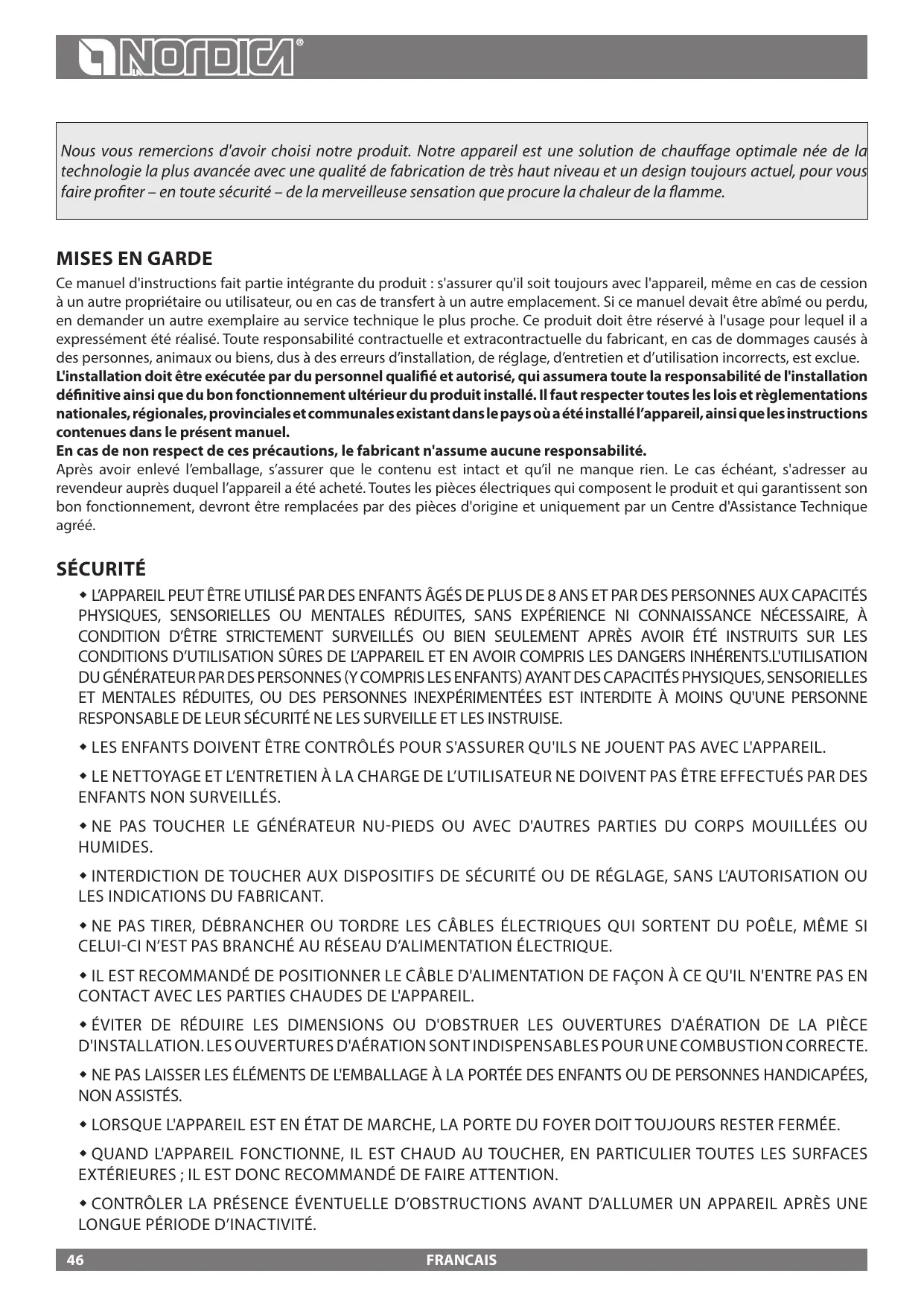 AVERTISSEMENTS GENERAUX La responsabilité de La société La NORDICA S.p.a. se limite à la fourniture de l'appareil.