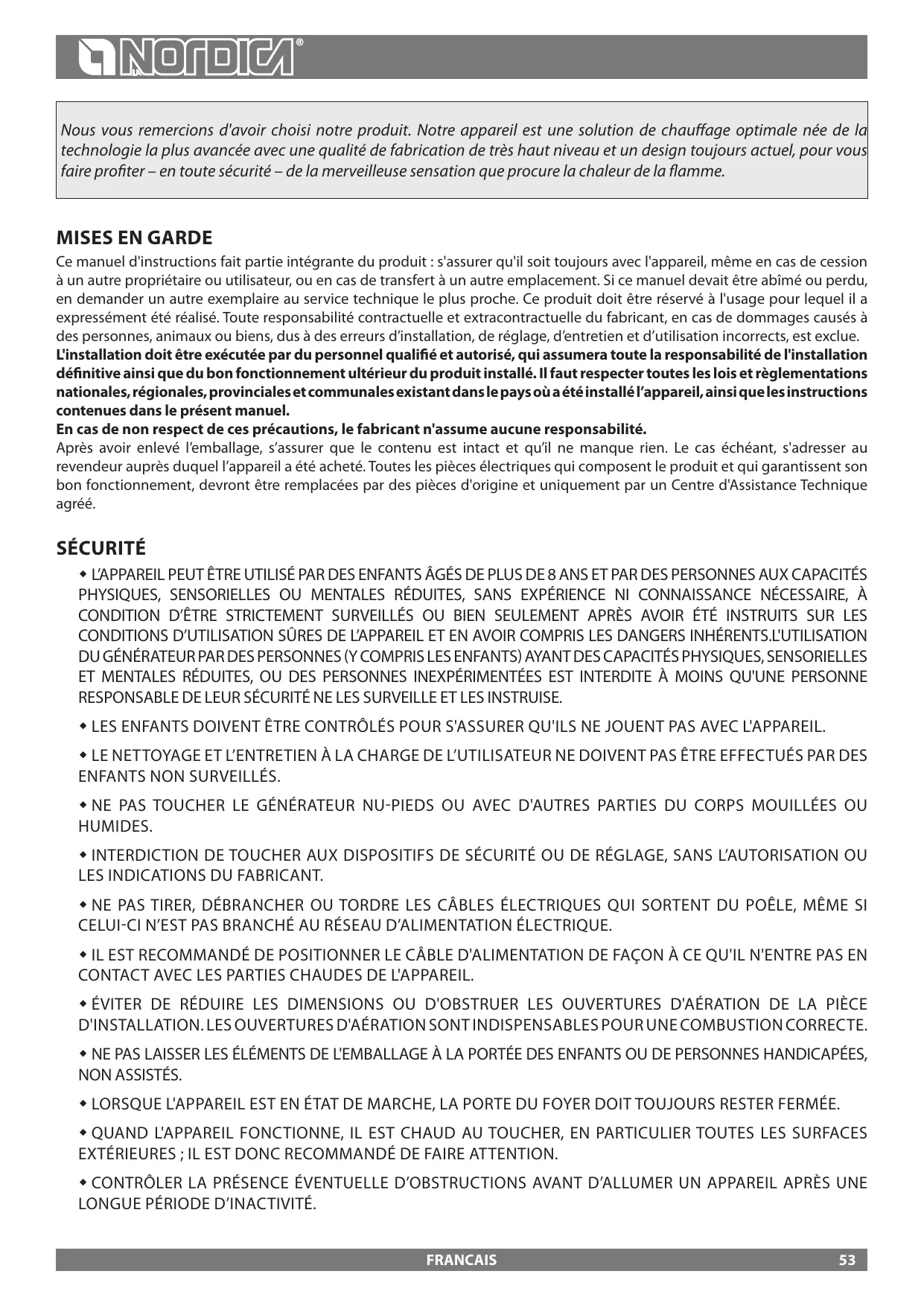 AVERTISSEMENTS GENERAUX La responsabilité de La société La NORDICA S.p.a. se limite à la fourniture de l'appareil.
