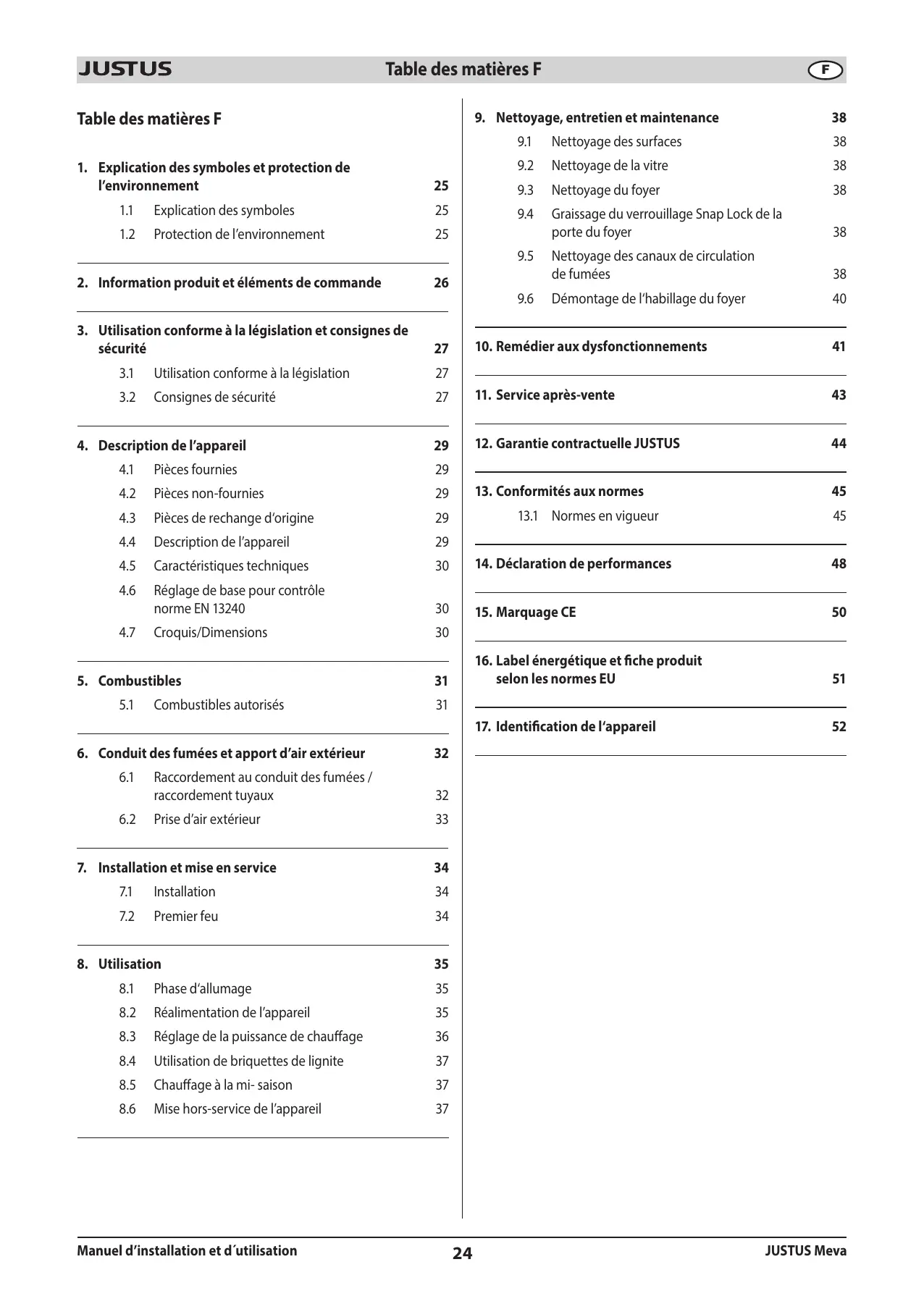 1.2 Protection de l’environnement 25 porte du foyer 38 9.5 Nettoyage des canaux de circulation 2. Information produit et éléments de commande 26 de fumées 36 9.6 Démontage de l'habillage du foyer 40 3. 27 10. Remédier aux dysfonctionnements a 31 Utilisation conforme à la législation 27 3.2 Consignes de sécurité 27 | 11. Service après-vente 43 4. Description de l'appareil 29 | 12. Garantie contractuelle JUSTUS 44 41 Pièces fournies 29 4.2 Pièces non-fournies 29 | 13. Conformités aux normes 45 8.5 Chauffage à la mi- saison 37 8.6 Mise hors-service de l'appareil 37 Manuel d'installation et d'utilisation 24 JUSTUS Meva
