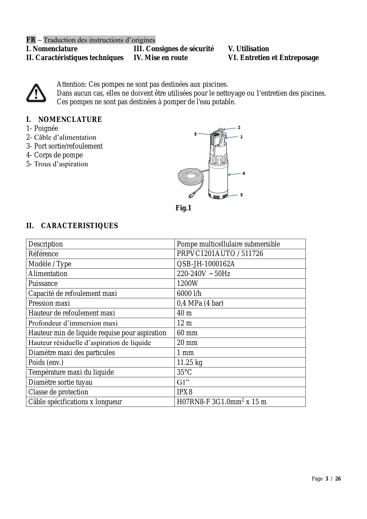 FR POMPE MULTICELLULAIRE SUBMERSIBLE 1200W AVEC CONTROLEUR AUTOMATIQUE & FLOTTEUR INTEGRES Manuel d'instructions et d'utilisation