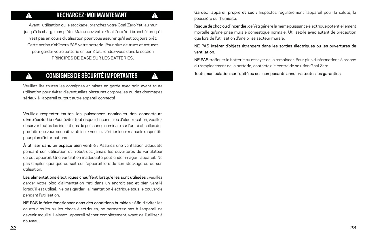 Risque de choc oud'incendie :ce Yeti génèrelamême puissance électrique potentiellement mortelle qu'une prise murale domestique normale. Utilisez-le avec autant de précaution que lors de l'utilisation d'une prise secteur murale