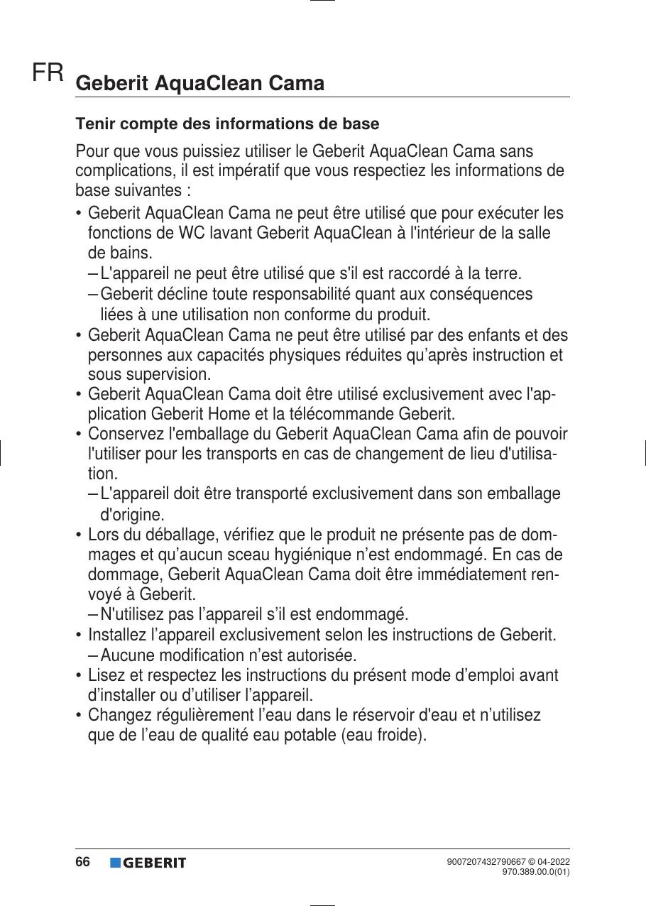 FR Geberit AquaClean Cama Tenir compte des informations de base Pour que vous puissiez utiliser le Geberit AquaClean Cama sans complications, il est impératif que vous respectiez les informations de base suivantes : + Geberit AquaClean Cama ne peut être utilisé que pour exécuter les fonctions de WC lavant Geberit AquaClean à l'intérieur de la salle de bains. — L'appareil ne peut être utilisé que s'il est raccordé à la terre. — Geberit décline toute responsabilité quant aux conséquences liées à une utilisation non conforme du produit. Geberit AquaClean Cama ne peut être utilisé par des enfants et des personnes aux capacités physiques réduites qu'après instruction et sous supervision. Geberit AquaClean Cama doit être utilisé exclusivement avec l'ap- plication Geberit Home et la télécommande Geberit. Conservez l'emballage du Geberit AquaClean Cama afin de pouvoir l'utiliser pour les transports en cas de changement de lieu d'utilisa- tion. — L'appareil doit être transporté exclusivement dans son emballage d'origine. Lors du déballage, vérifiez que le produit ne présente pas de dom- mages et qu'aucun sceau hygiénique n'est endommagé. En cas de dommage, Geberit AquaClean Cama doit être immédiatement ren- voyé à Geberit. — N'utilisez pas l'appareil s’il est endommagé. Installez l'appareil exclusivement selon les instructions de Geberit. — Aucune modification n'est autorisée. - Lisez et respectez les instructions du présent mode d'emploi avant d'installer ou d'utiliser l'appareil. + Changez régulièrement l’eau dans le réservoir d'eau et n'utilisez que de l’eau de qualité eau potable (eau froide).