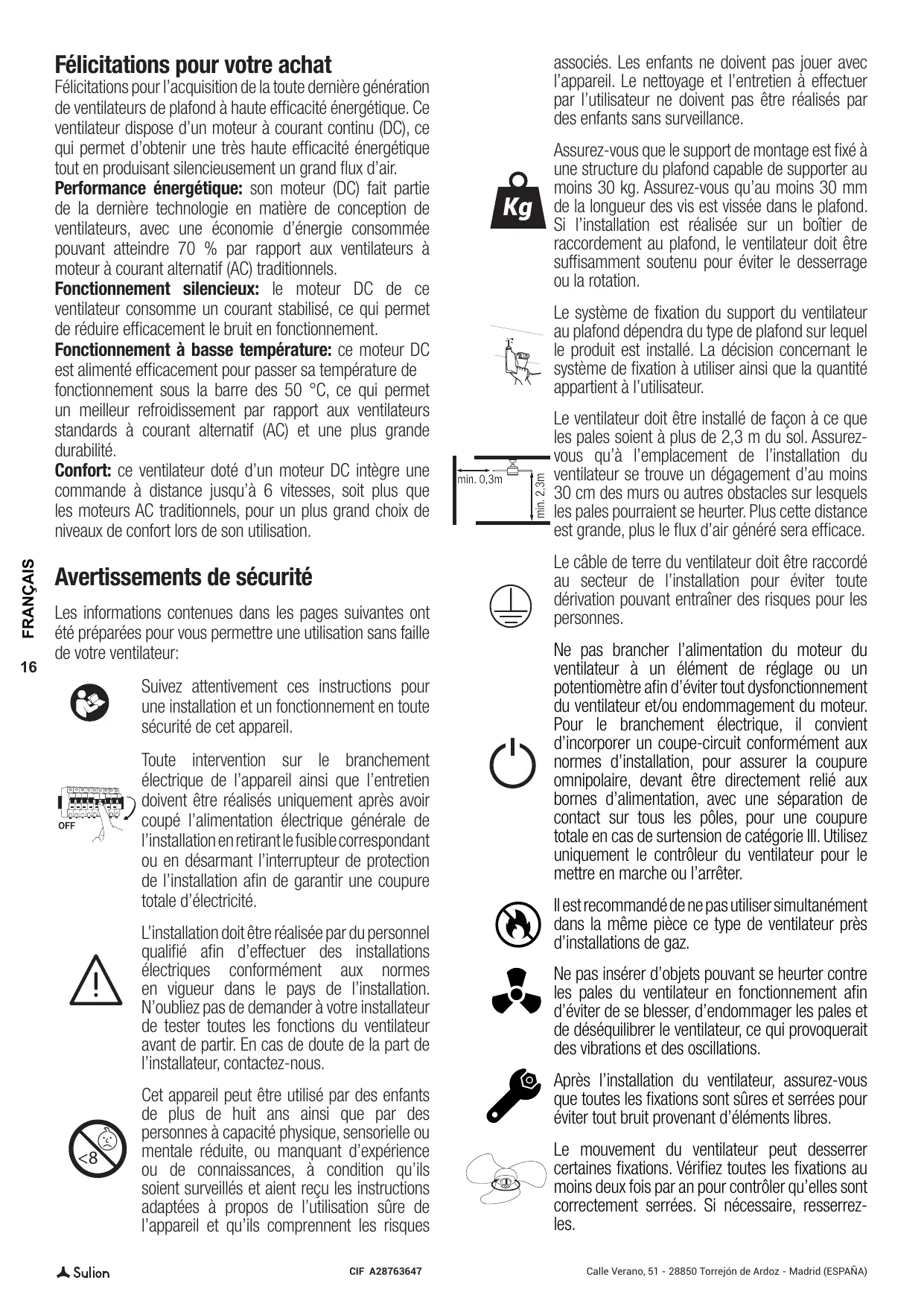 électriques conformément aux normes en vigueur dans le pays de l'installation. N'oubliez pas de demander à votre installateur de tester toutes les fonctions du ventilateur