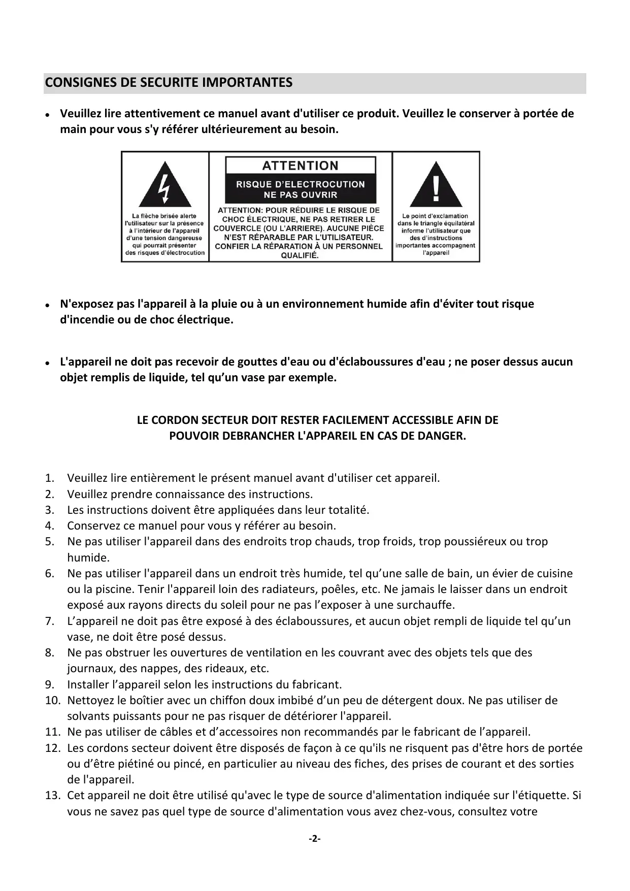 ATTENTION: POUR RÉDUIRE LE RISQUE DE La flèche brisée alerte É Le point d'exclamation l'utilisateur sur la présence | | CHOC ÉLECTRIQUE, NE PAS RETIRER LE dans le triangle équilatéral à l'intérieur de l'appareil | COUVERCLE (OU L'ARRIERE). AUCUNE PIÈCE | informe l'utilisateur que d'une tension dangereuse N'EST RÉPARABLE PAR L'UTILISATEUR. des d'instructions qui pourrait présenter | CONFIER LA RÉPARATION À UN PERSONNEL | importantes accompagnent des risques d'électrocution QUALIFIÉ. l'appareil N'exposez pas l'appareil à la pluie ou à un environnement humide afin d'éviter tout risque d'incendie ou de choc électrique. L'appareil ne doit pas recevoir de gouttes d'eau ou d'éclaboussures d'eau ; ne poser dessus aucun objet remplis de liquide, tel qu’un vase par exemple. LE CORDON SECTEUR DOIT RESTER FACILEMENT ACCESSIBLE AFIN DE POUVOIR DEBRANCHER L'APPAREIL EN CAS DE DANGER. Veuillez lire entièrement le présent manuel avant d'utiliser cet appareil. Veuillez prendre connaissance des instructions. Les instructions doivent être appliquées dans leur totalité. Conservez ce manuel pour vous y référer au besoin. Ne pas utiliser l'appareil dans des endroits trop chauds, trop froids, trop poussiéreux ou trop humide. Ne pas utiliser l'appareil dans un endroit très humide, tel qu’une salle de bain, un évier de cuisine ou la piscine. Tenir l'appareil loin des radiateurs, poêles, etc. Ne jamais le laisser dans un endroit exposé aux rayons directs du soleil pour ne pas l’exposer à une surchauffe. L'appareil ne doit pas être exposé à des éclaboussures, et aucun objet rempli de liquide tel qu’un vase, ne doit être posé dessus. Ne pas obstruer les ouvertures de ventilation en les couvrant avec des objets tels que des journaux, des nappes, des rideaux, etc. Installer l'appareil selon les instructions du fabricant. . Nettoyez le boîtier avec un chiffon doux imbibé d’un peu de détergent doux. Ne pas utiliser de solvants puissants pour ne pas risquer de détériorer l'appareil. . Ne pas utiliser de câbles et d'accessoires non recommandés par le fabricant de l’appareil. . Les cordons secteur doivent être disposés de façon à ce qu'ils ne risquent pas d'être hors de portée ou d’être piétiné ou pincé, en particulier au niveau des fiches, des prises de courant et des sorties de l'appareil. Cet appareil ne doit être utilisé qu'avec le type de source d'alimentation indiquée sur l'étiquette. Si vous ne savez pas quel type de source d'alimentation vous avez chez-vous, consultez votre
