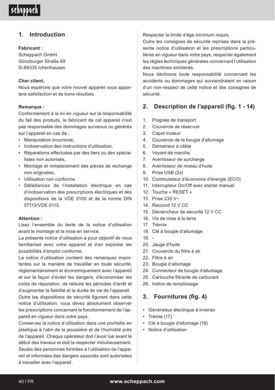 . Fournitures (fig. 4) + Générateur électrique à inverter Trémie (17) + Clé à bougie d'allumage (18) Notice d'utilisation IFR www.scheppach.com