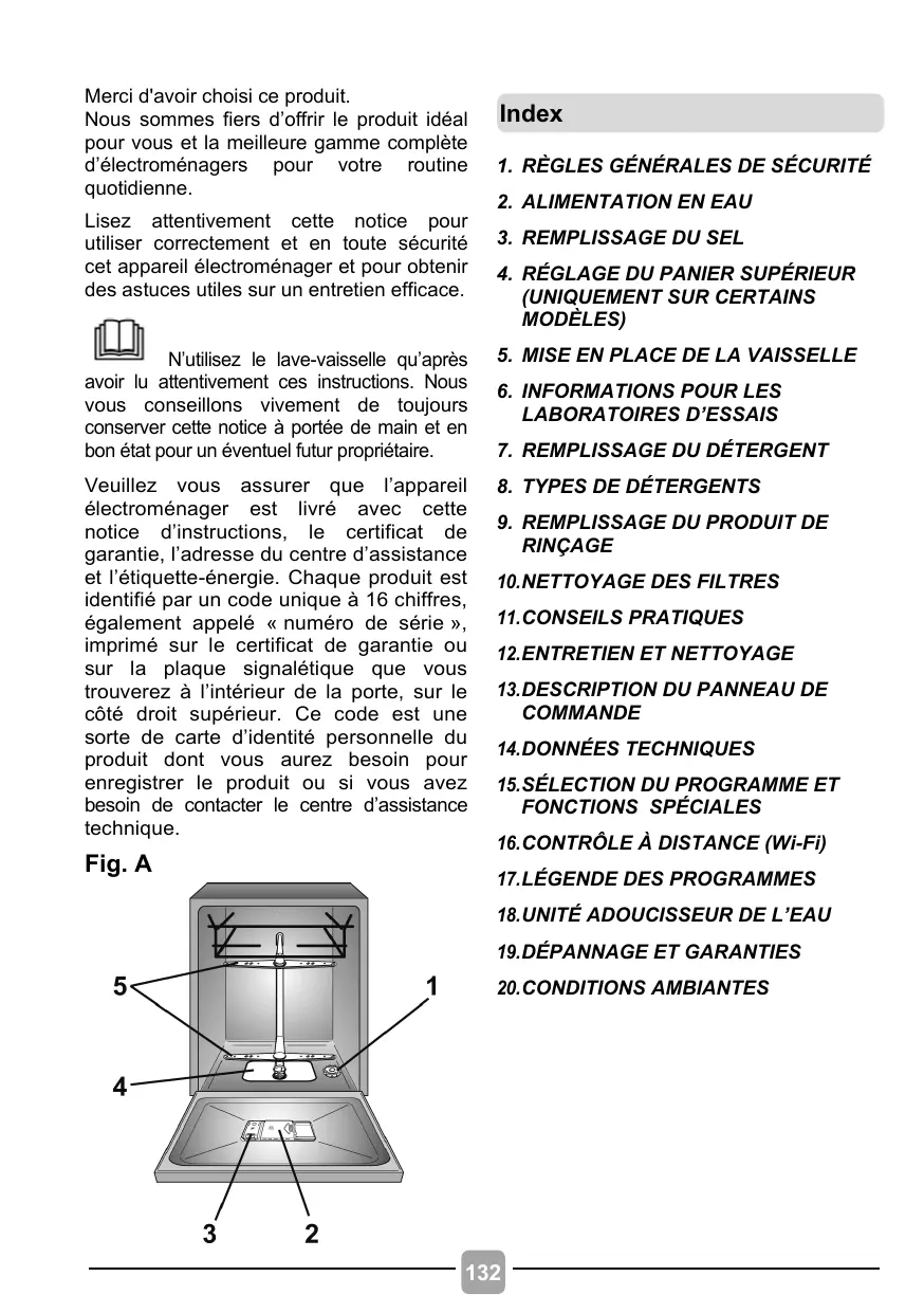 Merci d'avoir choisi ce produit. Nous sommes fiers d'offrir le produit idéal pour vous et la meilleure gamme complète d'électroménagers pour votre routine quotidienne. Lisez attentivement cette notice pour utiliser correctement et en toute sécurité cet appareil électroménager et pour obtenir des astuces utiles sur un entretien efficace. (D N'utilisez le lave-vaisselle qu'après avoir lu attentivement ces instructions. Nous vous conseillons vivement de toujours conserver cette notice à portée de main et en bon état pour un éventuel futur propriétaire. Veuillez vous assurer électroménager est livré avec cette notice d'instructions, le certificat de garantie, l'adresse du centre d'assistance et l'étiquette-énergie. Chaque produit est identifié par un code unique à 16 chiffres, également appelé « numéro de série », imprimé sur le certificat de garantie ou sur la plaque signalétique que vous trouverez à l'intérieur de la porte, sur le côté droit supérieur. Ce code est une sorte de carte d'identité personnelle du produit dont vous aurez besoin pour enregistrer le produit ou si vous avez besoin de contacter le centre d'assistance technique. Fig. A que l'appareil Index