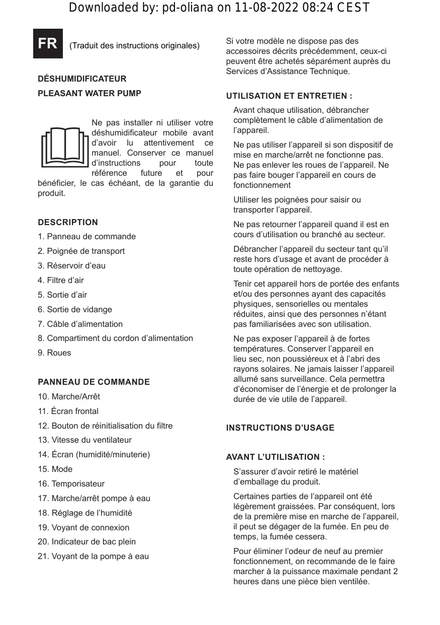 Ne pas installer ni utiliser votre déshumidificateur mobile avant d'avoir lu attentivement ce manuel. Conserver ce manuel d'instructions pour toute référence future et pour bénéficier, le cas échéant, de la garantie du produit. DESCRIPTION