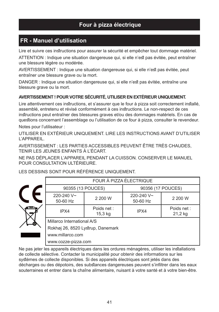 - Lire attentivement les instructions suivantes, et s'assurer que le four à pizza soit correctement installé, assemblé et entretenu. Le non-respect de ces instructions peut entraîner des blessures graves et/ou des dommages matériels.