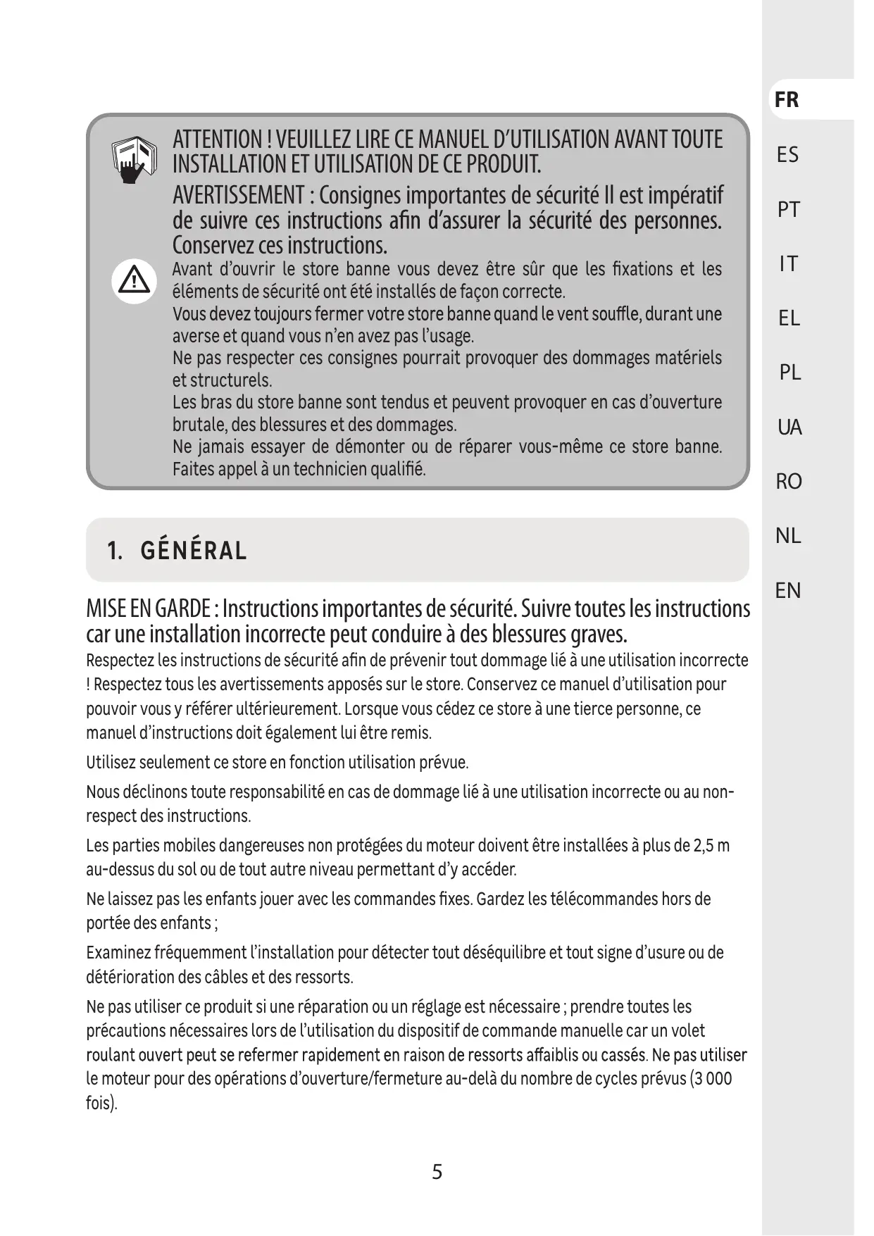 AVERTISSEMENT : Consignes importantes de sécurité Il est impératif de suivre ces instructions afin d'assurer la sécurité des personnes. Conservez ces instructions. VAN Avant d'ouvrir le store banne vous devez être sûr que les fixations et Les éléments de sécurité ont été installés de façon correcte. Vous devez toujours fermer votre store banne quand le vent souffle, durant une averse et quand vous n’en avez pas l'usage. Ne pas respecter ces consignes pourrait provoquer des dommages matériels et structurels. Les bras du store banne sont tendus et peuvent provoquer en cas d'ouverture brutale, des blessures et des dommages. Ne jamais essayer de démonter ou de réparer vous-même ce store banne. LC Faites appel à un technicien qualifié. )
