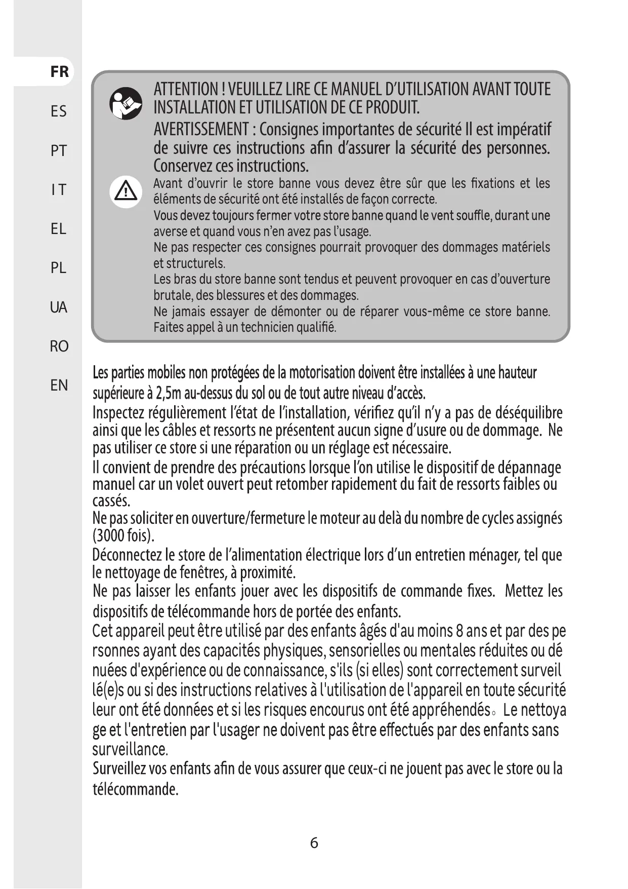 éléments de sécurité ont été installés de façon correcte. Vous devez toujours fermer votre store banne quand Le vent souffle, durant une averse et quand vous n’en avez pas l'usage. Ne pas respecter ces consignes pourrait provoquer des dommages matériels et structurels. Les bras du store banne sont tendus et peuvent provoquer en cas d'ouverture brutale, des blessures et des dommages. Ne jamais essayer de démonter ou de réparer vous-même ce store banne.