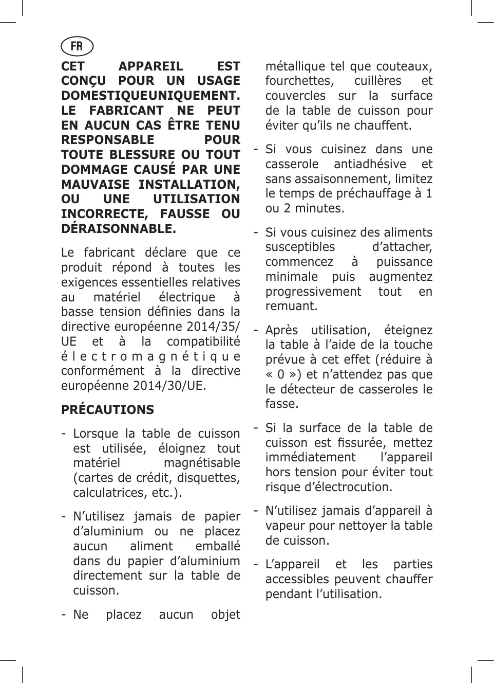 DÉRAISONNABLE. Le fabricant déclare que ce produit répond à toutes les exigences essentielles relatives au matériel électrique à basse tension définies dans la directive européenne 2014/35/ UE et à la compatibilité électromagnétique conformément à la directive européenne 2014/30/UE. PRÉCAUTIONS - Lorsque la table de cuisson est utilisée, éloignez tout matériel magnétisable (cartes de crédit, disquettes, calculatrices, etc.). - N'utilisez jamais de papier d'aluminium ou ne placez aucun aliment emballé dans du papier d'aluminium directement sur la table de cuisson. - Ne placez aucun objet métallique tel que couteaux, fourchettes, cuillères et couvercles sur la surface de la table de cuisson pour éviter qu'ils ne chauffent. Si vous cuisinez dans une casserole antiadhésive et sans assaisonnement, limitez le temps de préchauffage à 1 ou 2 minutes. Si vous cuisinez des aliments susceptibles d'attacher, commencez à puissance minimale puis augmentez progressivement tout en remuant. Après utilisation, éteignez la table à l’aide de la touche prévue à cet effet (réduire à « 0 >) et n'attendez pas que le détecteur de casseroles le fasse. Si la surface de la table de cuisson est fissurée, mettez immédiatement l'appareil hors tension pour éviter tout risque d'électrocution. N'utilisez jamais d'appareil à vapeur pour nettoyer la table de cuisson. L'appareil et les parties accessibles peuvent chauffer pendant l'utilisation.