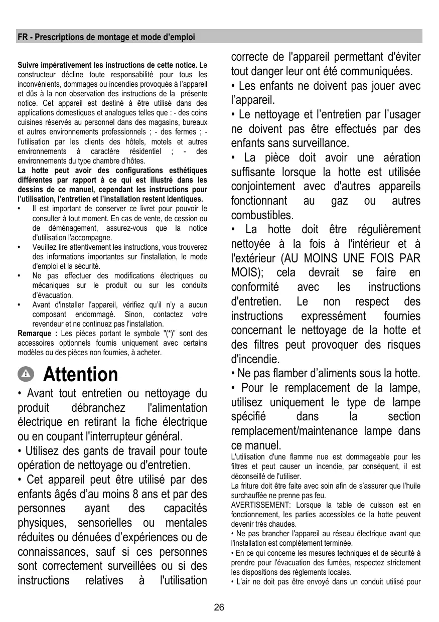 + La hotte ne doit JAMAIS être utilisée comme une surface d'appui, sauf indication expresse.