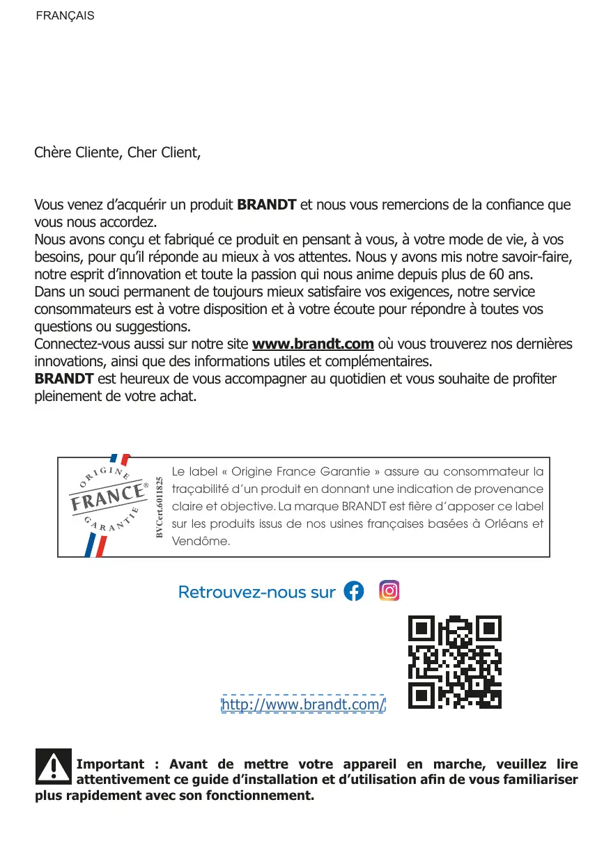 BRANDT est heureux de vous accompagner au quotidien et vous souhaite de profiter pleinement de votre achat.
