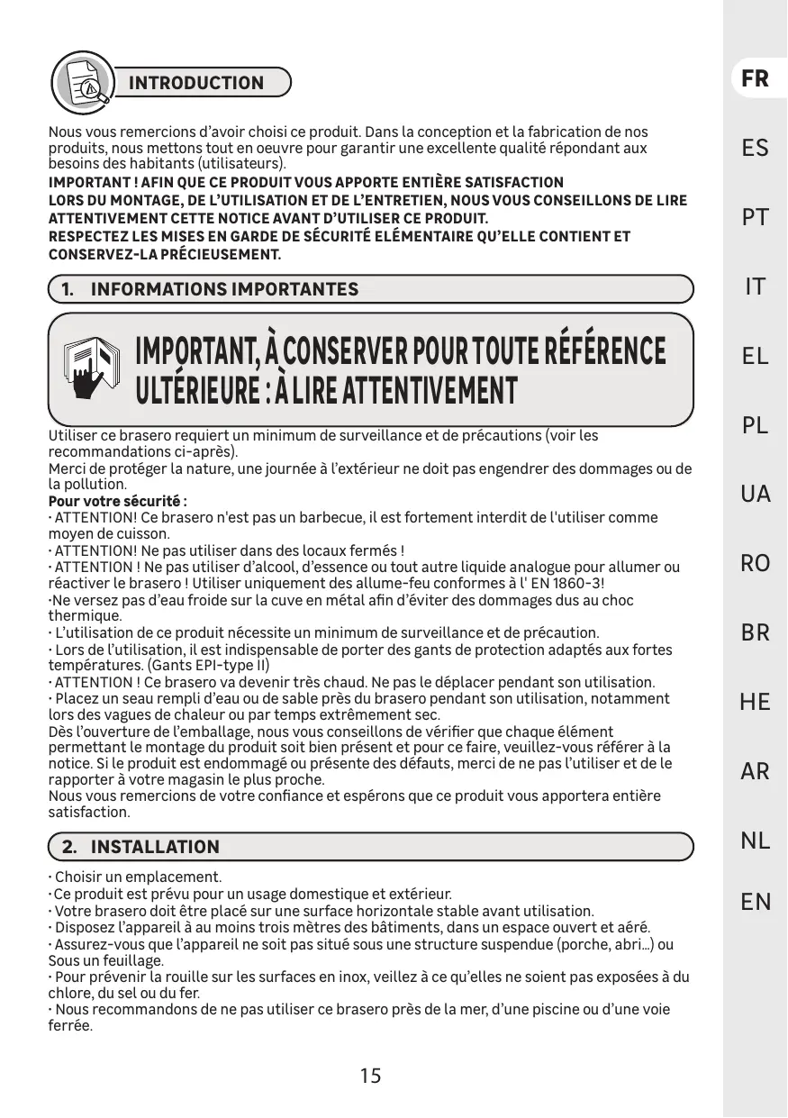 Pour votre sécuri * ATTENTION! Ce brasero n'est pas un barbecue, il est fortement interdit de l'utiliser comme moyen de cuisson.