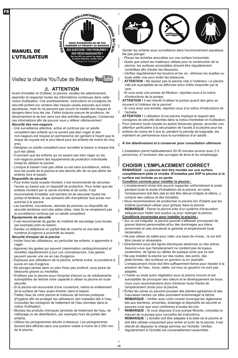 L'UTILISATEUR EE Visitez la chaîne YouTube de Bestway YouQ{lE}) 1 À ATTENTION