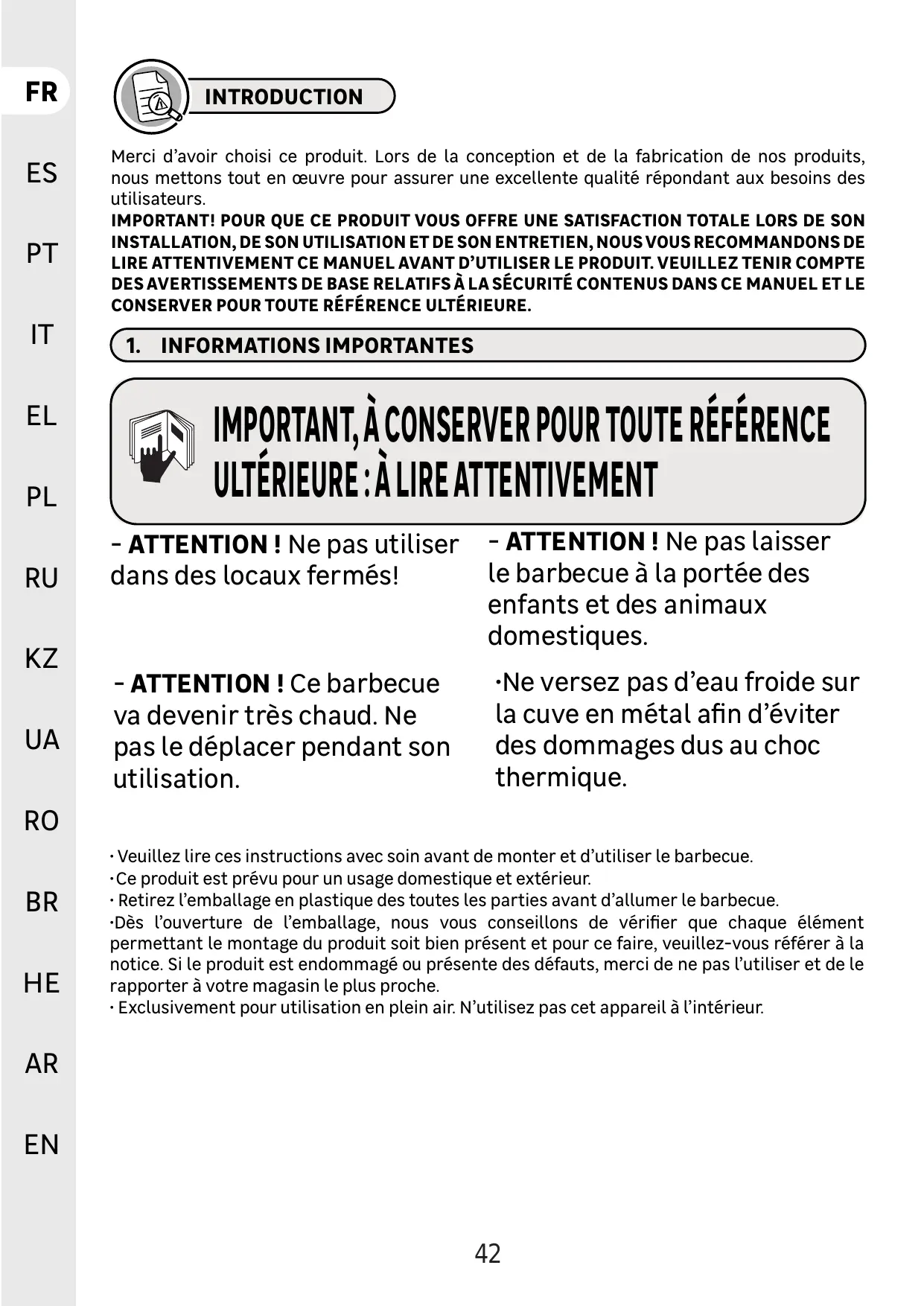 - Veuillez lire ces instructions avec soin avant de monter et d'utiliser Le barbecue.