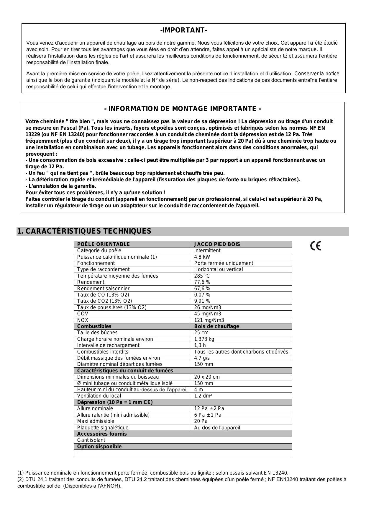1. CARACTÉRISTIQUES TECHNIQUES POËLE ORIENTABLE JACCO PIED BOIS CE Catégorie du poêle intermittent Puissance calorifique nominale (1) 4,8 kW Fonctionnement Porte fermée uniquement Type de raccordement Horizontal ou vertical