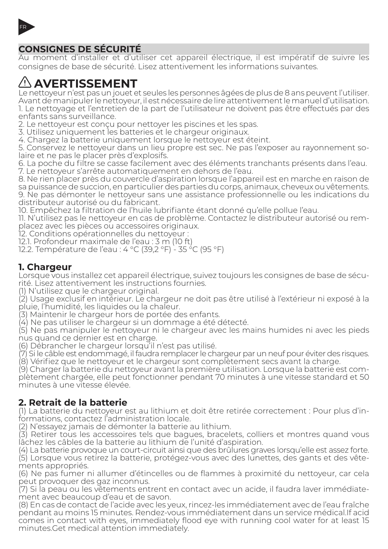 Les avertissements et précautions précédents ne sont pas exhaustifs et ils ne com- prennent pas toutes les hypothèses de risque ou de blessures graves. Les propriétaires des piscines où spas doivent à tout moment être pleinement attentifs et faire preuve de bon sens lorsqu'ils utilisent le nettoyeur