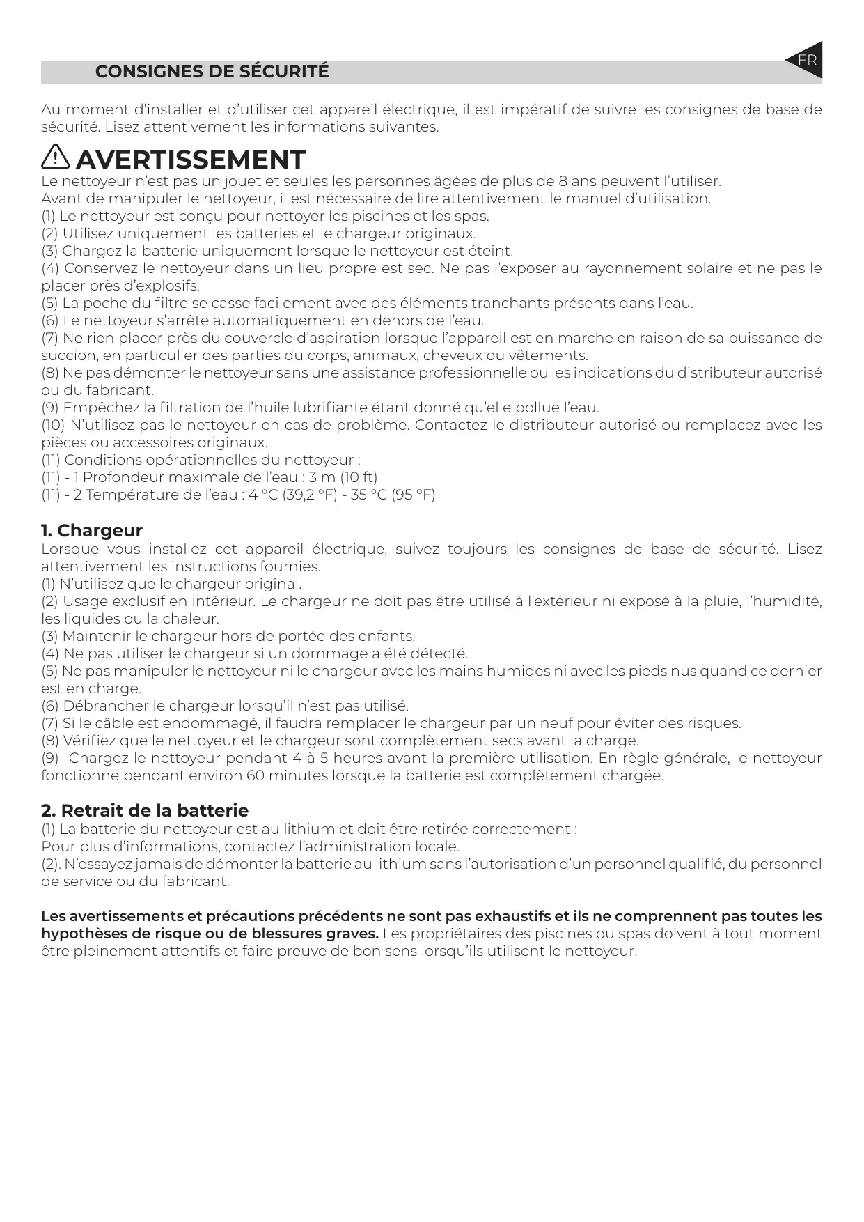 Les avertissements et précautions précédents ne sont pas exhaustifs et ils ne comprennent pas toutes les hypothèses de risque ou de blessures graves. Les propriétaires des piscines où spas doivent à tout moment