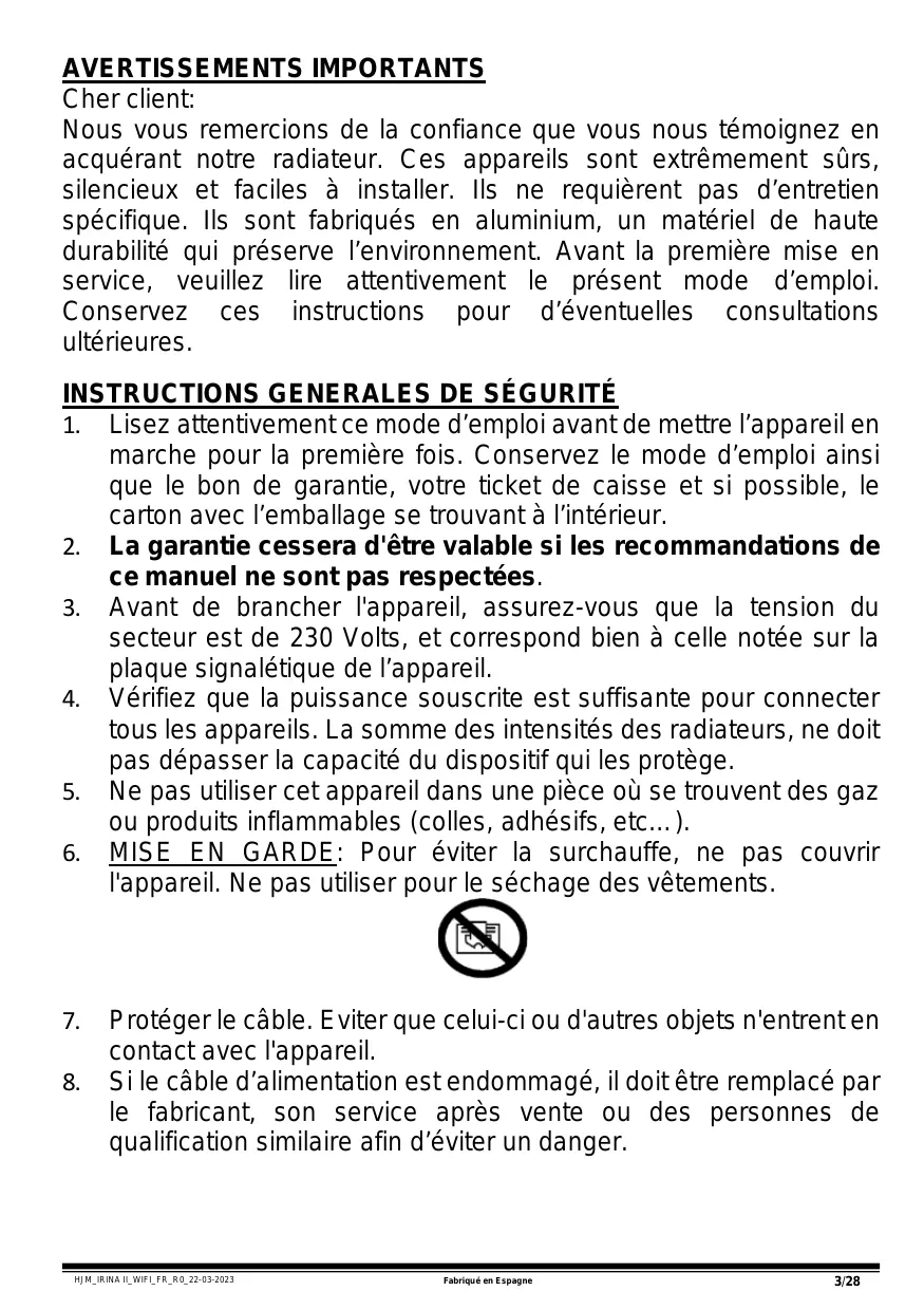 Ce radiateur est conçu pour être utilisé uniquement fixé à un mur. En ce qui concerne les informations détaillées sur la méthode de fixation, référez-vous à la section “INSTALLATION ET FIXATION AU MUR” dans ce manuel. Il convient de noter qu'un moyen de déconnexion ayant une distance d'ouverture des contacts de tous les pôles, assurant une coupure complète dans les conditions de catégorie de surtension Ill du réseau d'alimentation, doit être prévu dans la canalisation fixe conformément aux règles d'installation. L'appareil doit être alimenté par l'intermédiaire d'un dispositif à courant différentiel résiduel (DDR) ayant un courant différentiel de fonctionnement assigné ne dépassant pas 30 mA (demander conseil à un électricien qualifié). Ne pas utiliser des accessoires non recommandés par le fabricant, cela peut présenter un danger pour l'utilisateur et risque d'endommager l'appareil. N'utilisez que les accessoires d'origine. Par mesure de sécurité vis-à-vis des enfants, ne laissez pas les emballages (sac en plastique, carton, polystyrène) à leur portée. N'utilisez cet appareil que pour un usage privé et pour les tâches auxquelles il est destiné. Cet appareil n'est pas prévu pour une utilisation professionnelle. En aucun cas, il ne doit être utilisé à l'extérieur, dans des serres ou pour la reproduction et l'élevage d'animaux!!! Protégez- le de la chaleur, des rayons directs du soleil, de l'humidité (ne le plongez en aucun cas dans l'eau) et des objets tranchants. N'utilisez pas cet appareil avec des mains humides. S'il arrive que de l'humidité ou de l’eau atteignent l'appareil, coupez aussitôt son alimentation. Ne touchez pas les parties mouillées. Ne réparez pas l'appareil vous-même. Contactez un technicien qualifié. Respectez les “INSTRUCIONS DE SÉCURITÉ SPÉCIFIQUES À CET APPAREIL" données ci-après. Dans le cas où le radiateur qui se défait contient de l'huile; Les dispositions concernant les déchets d'huile doivent être suivies. MR LMI LRROL22 03207 Fabriqué en Espagne 5728